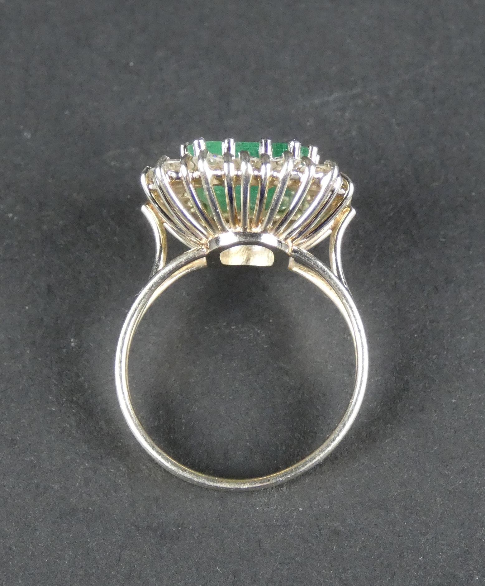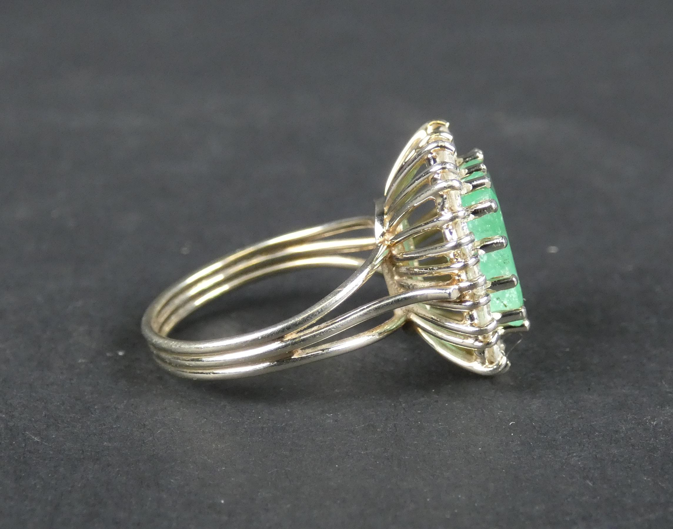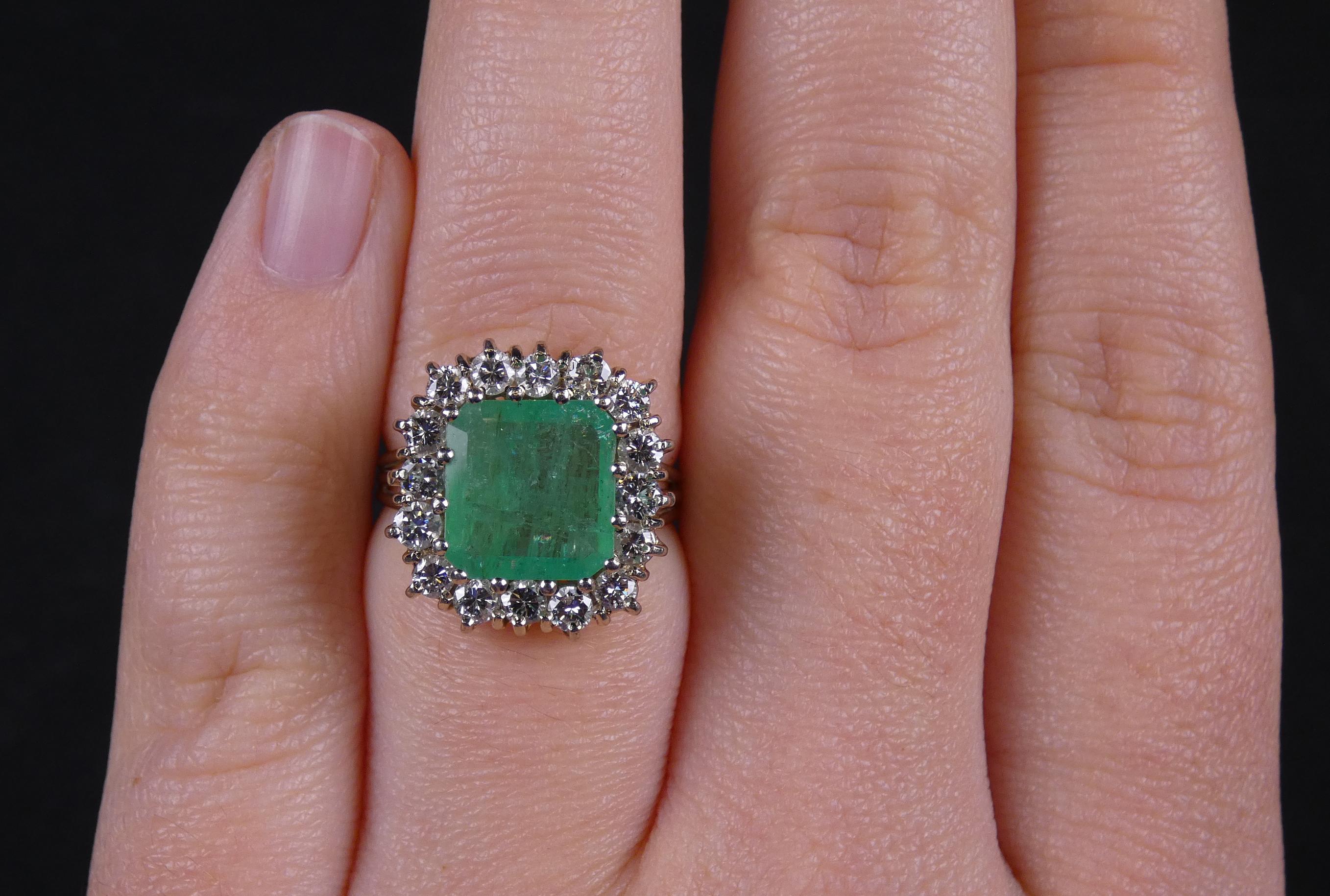 Bijou: Bague en or blanc 18K sertie d'une émeraude (fêle) d'un peu plus de 4cts entourée de 16 diamants d'env. 0,07cts P: 6,9g TDD: 56