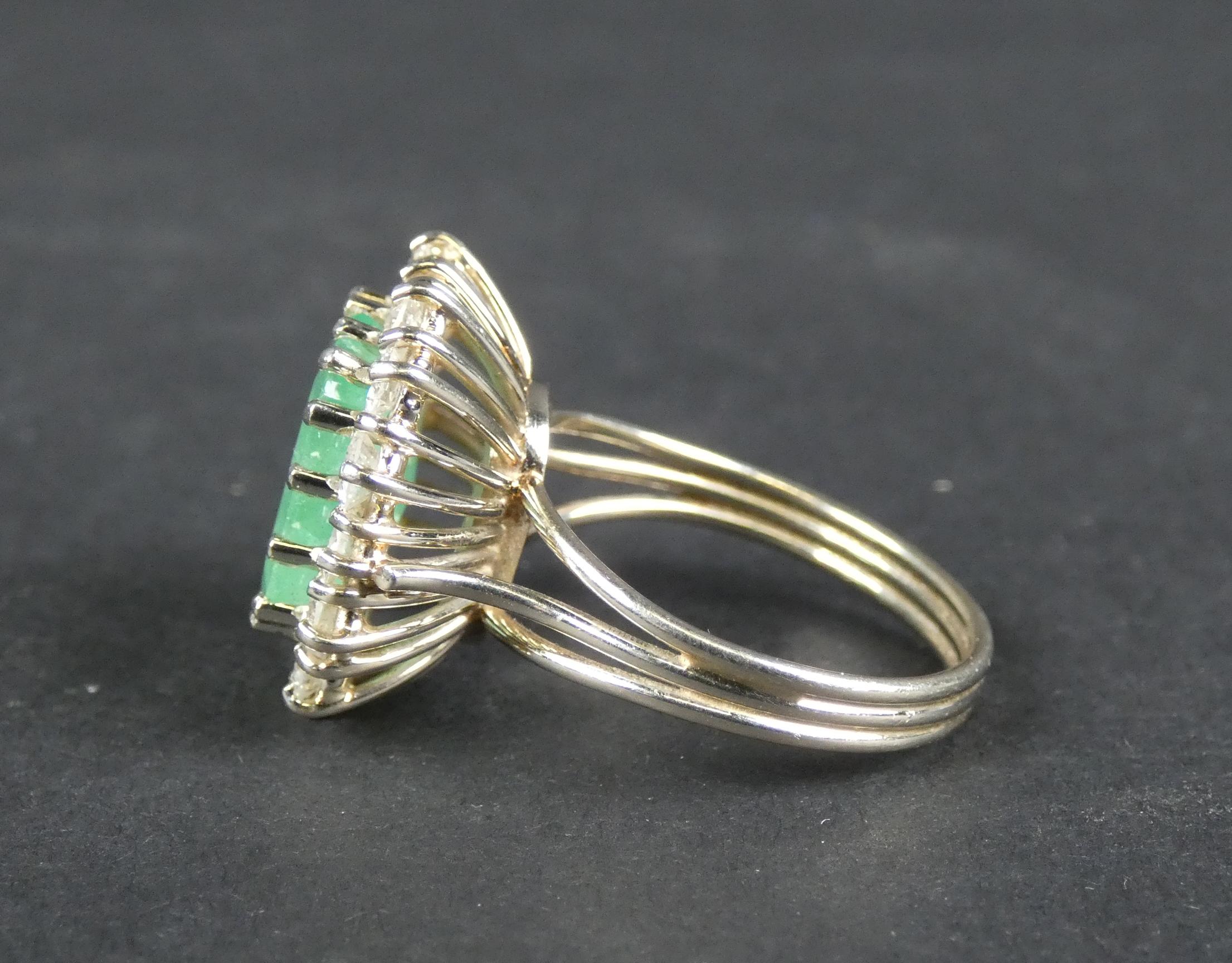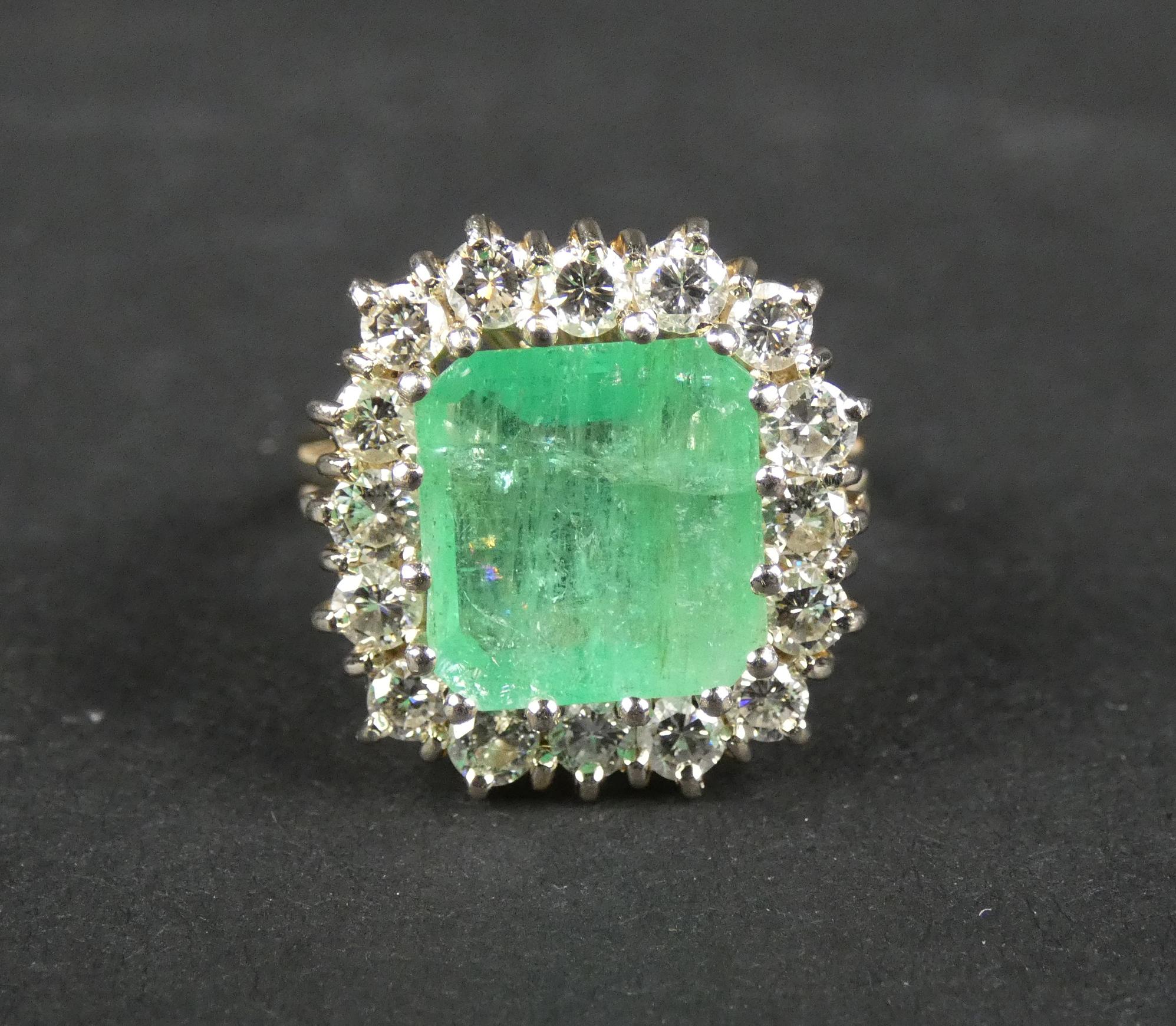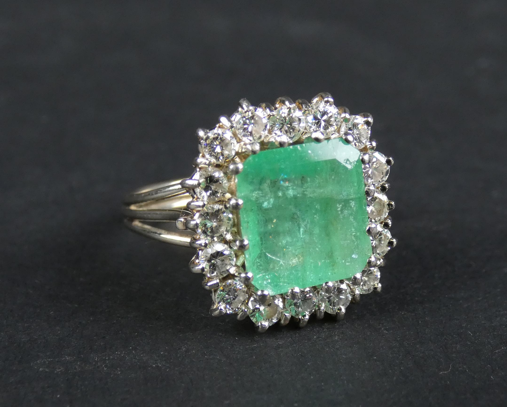 Bijou: Bague en or blanc 18K sertie d'une émeraude (fêle) d'un peu plus de 4cts entourée de 16 diamants d'env. 0,07cts P: 6,9g TDD: 56