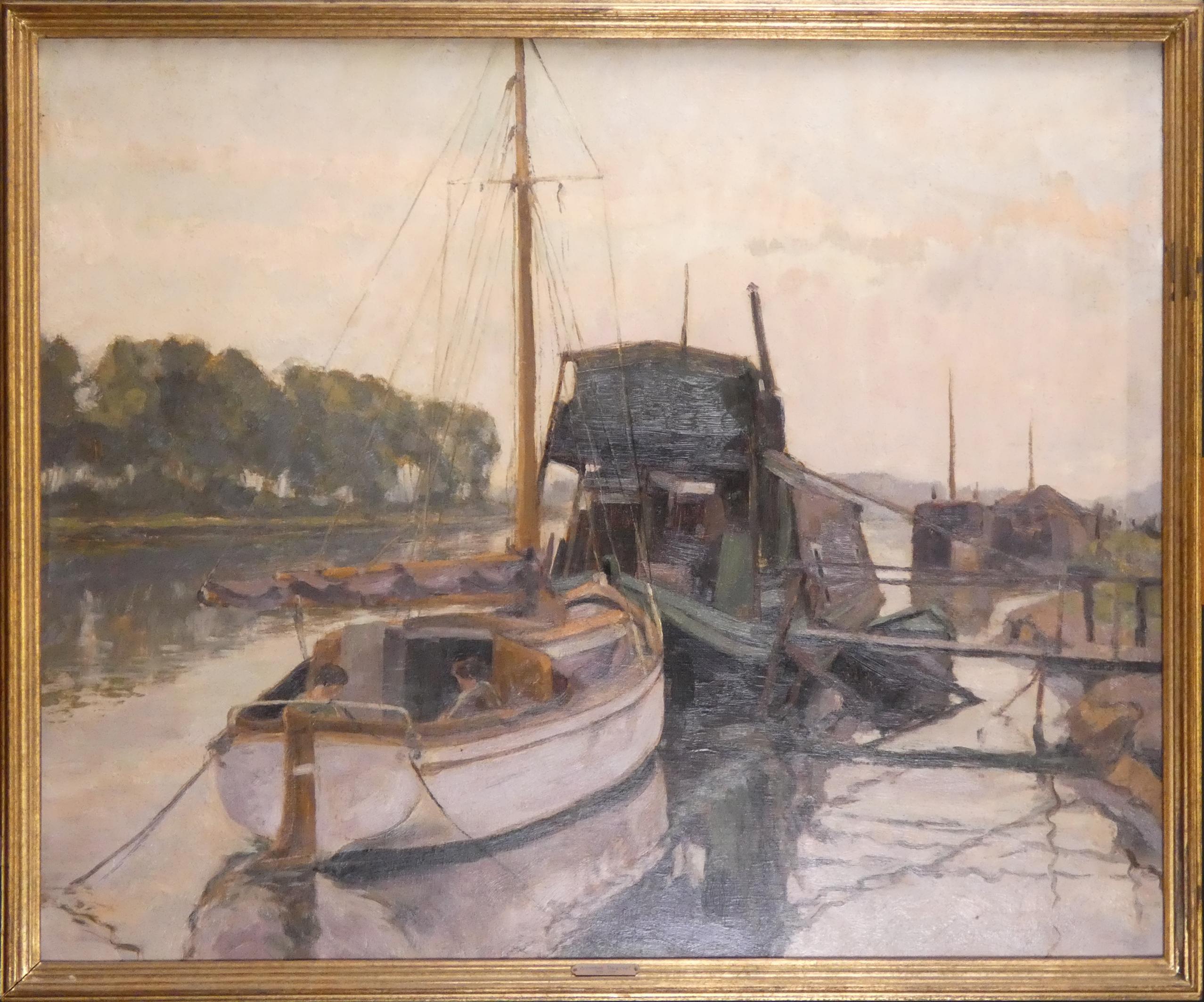 Tableau HST -Marine- attribué à *DEGREEF A.* (Amédée) (1878, 1969) étiq de particip à l'expo -Salon d'ensemble des peintres de l'école rouge 1974/1975- 75x90cm c doré