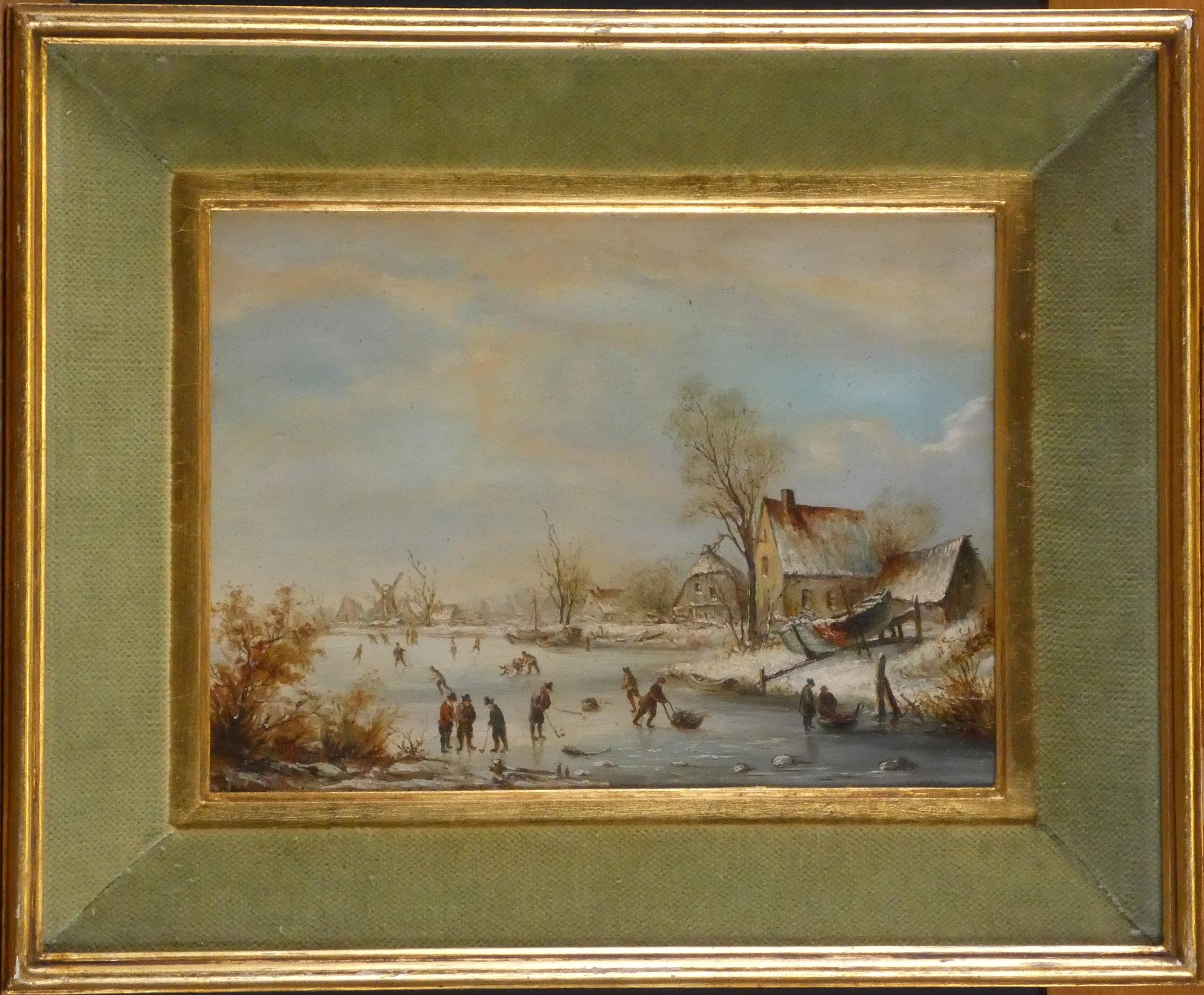 Tableau HSB -Paysage hivernal animé- signé MICHEL 17,5x23cm cadre doré sous verre
