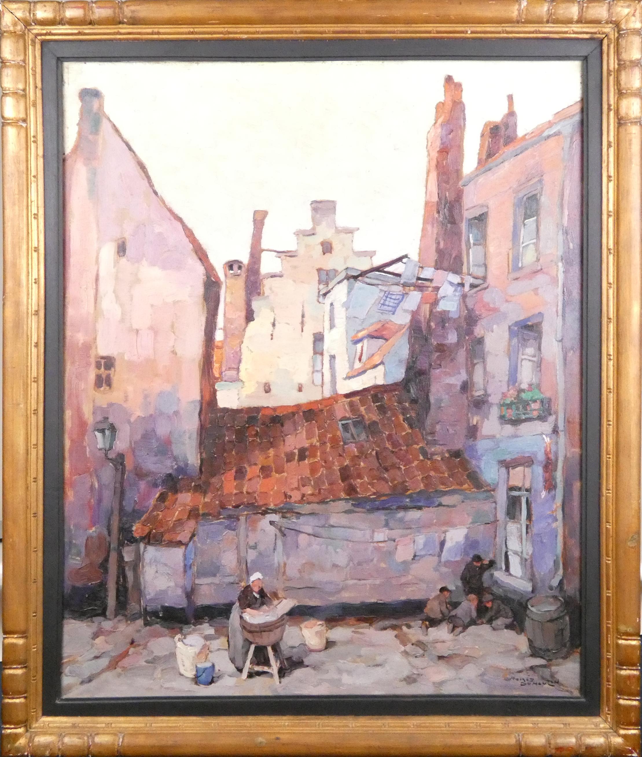 Tableau HST -Lavandière et joueurs de billes- signé *DUMOULIN R.* (Roméo) (1883, 1944) 85x70cm cadre doré