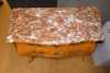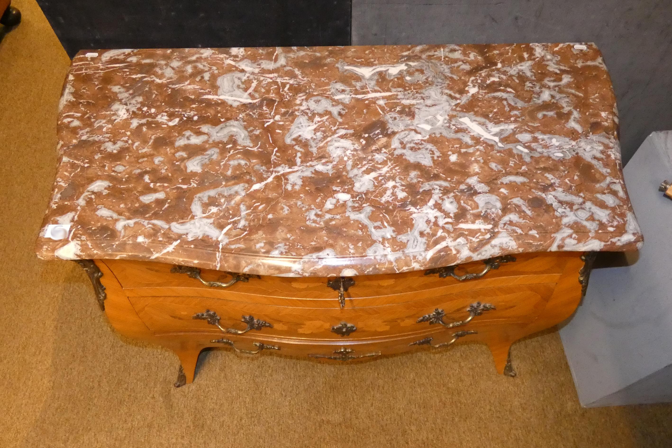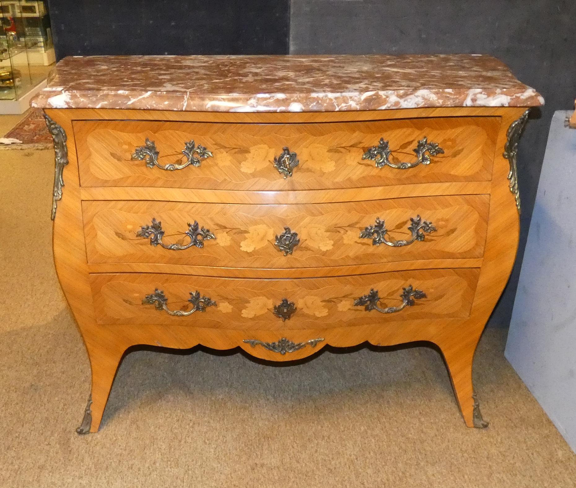 Meuble: Commode face et cotés galbés de style Louis XV 1ere moitié 20eS décor de marqueterie de fleurs 3 tiroirs dessus marbre 86x113x54cm