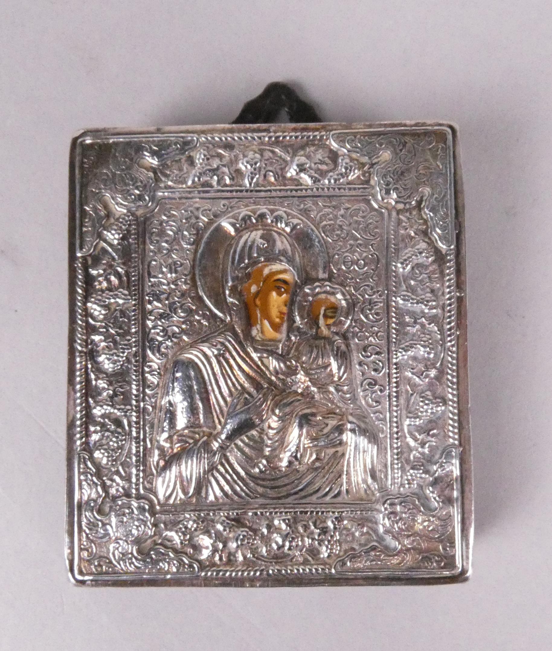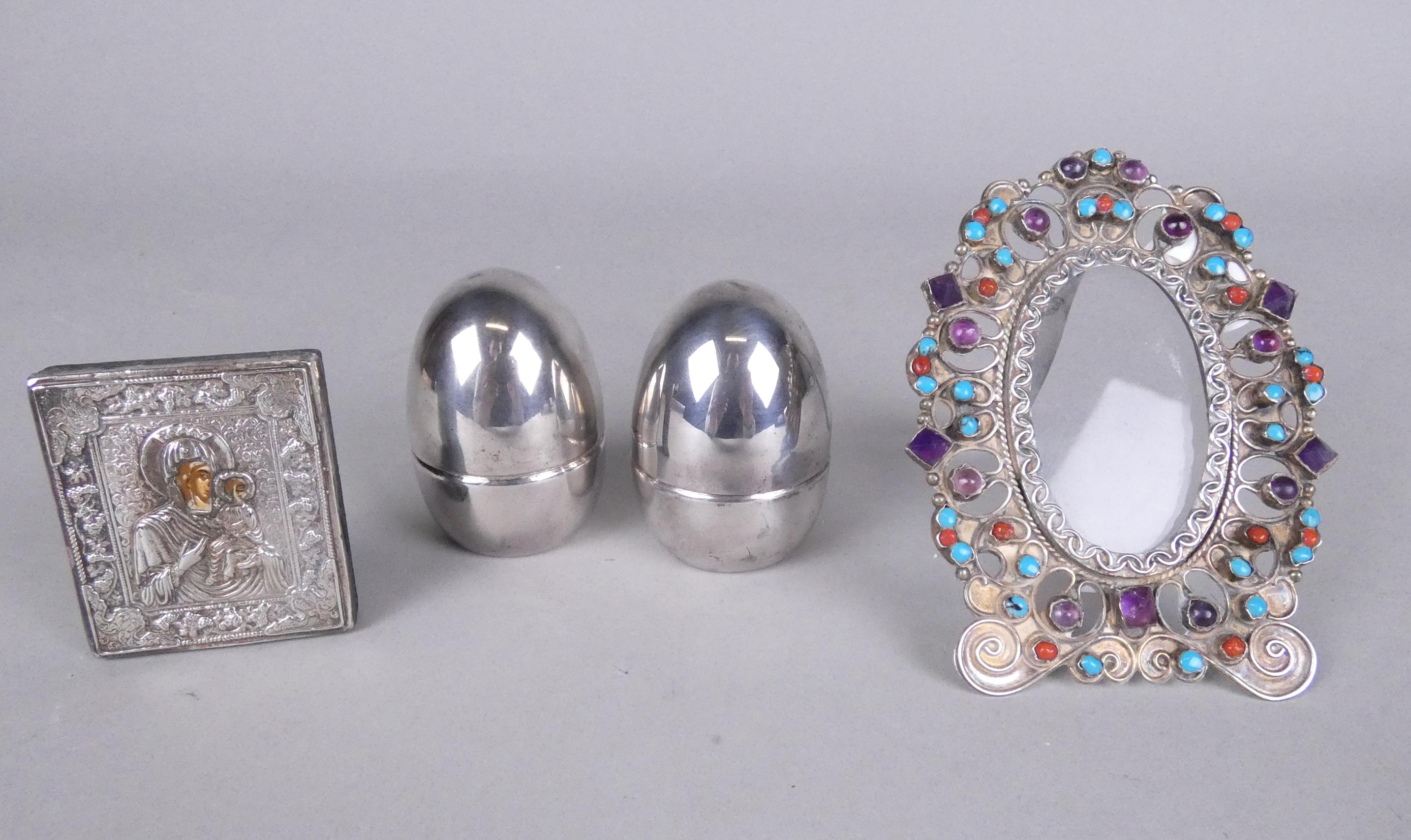 Argenterie : objets en argent: icône peinte à la main , paire de boites à bijoux , cadre avec verroterie