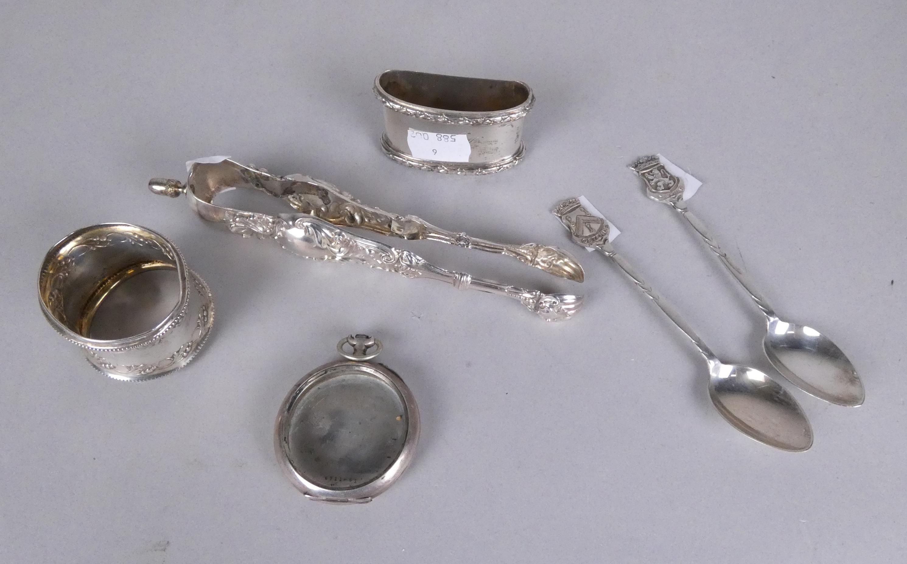Argenterie: objets en argent (6pcs) Poids:156g dont: 1 pince à sucre, 2 ronds de serviette.