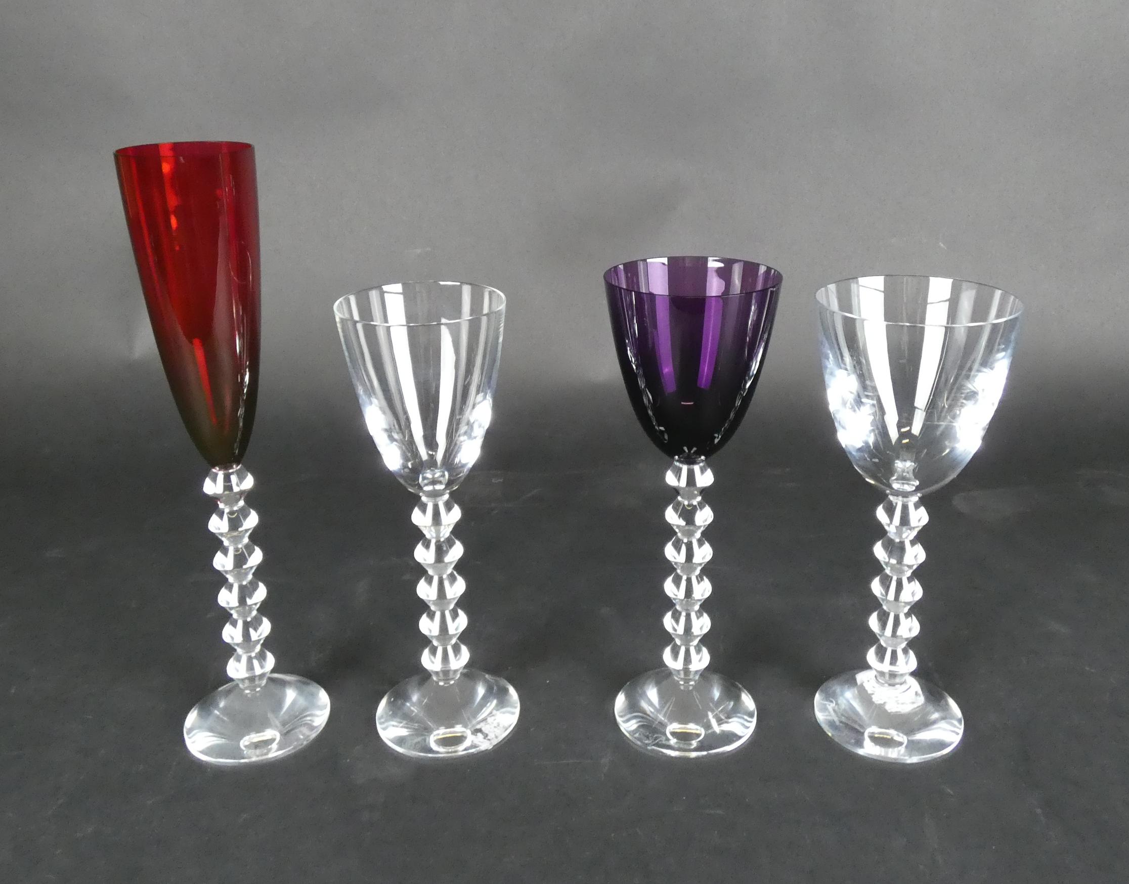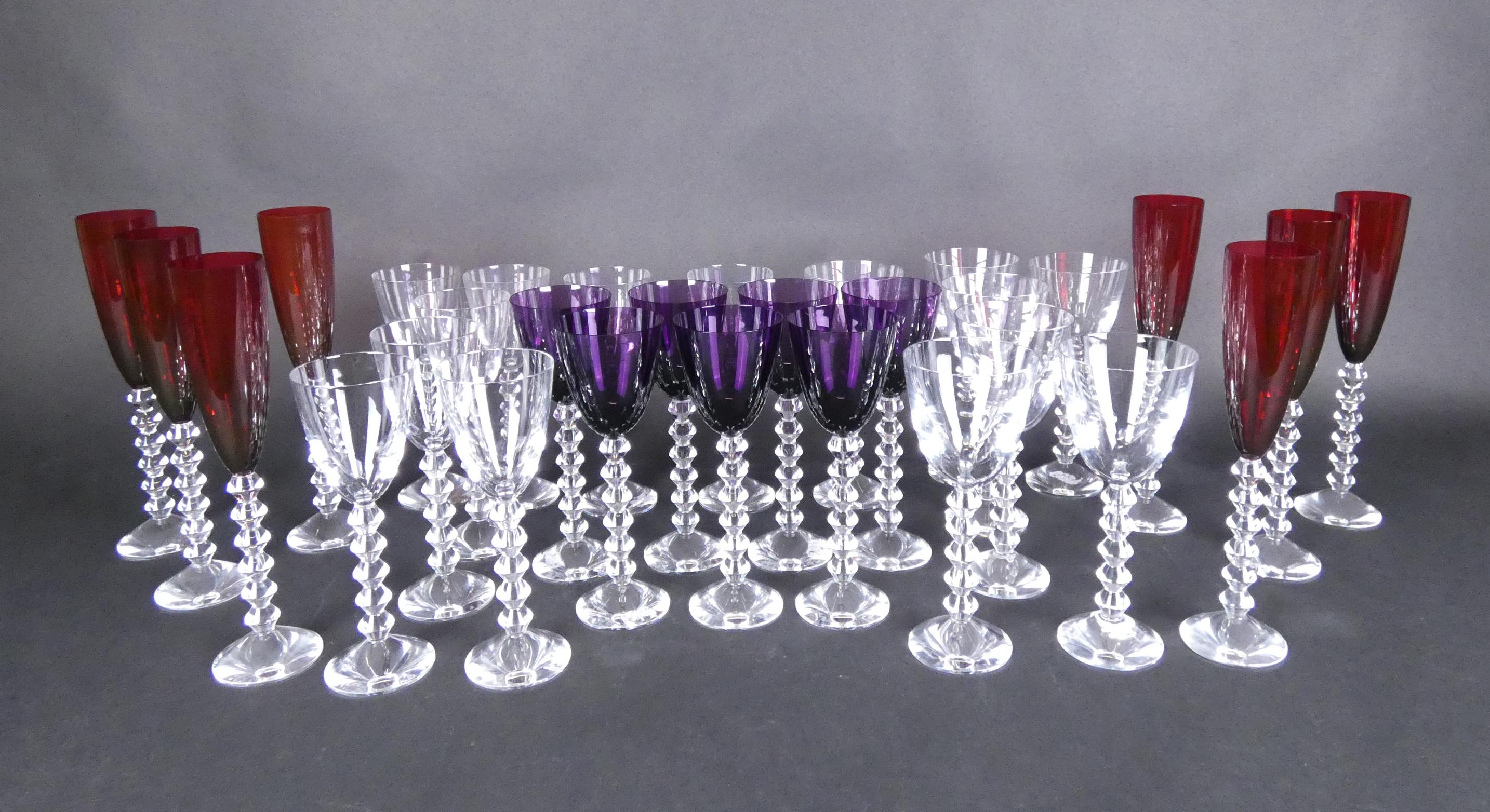 Verrerie: Rare service de verres en cristal taillé estampillé Baccarat modèle Vega (30pcs): 8 flûtes à champagne, 7 verres à eau, 7 verres bicolores, 8 verres à vin