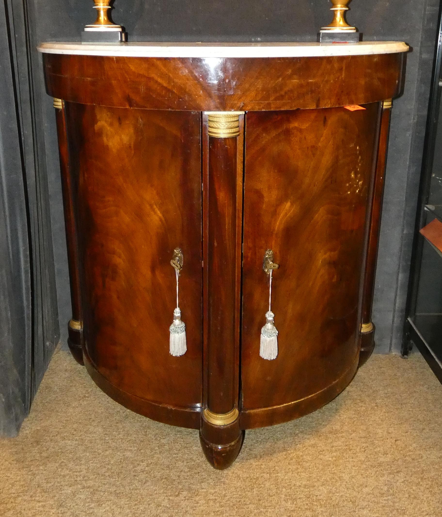Meuble: Demi-lune en acajou d'époque Empire dessus marbre ouvrant par 2 portes 3 montants colonnes avec piètement et chapiteaux en bronze 93x90x46cm