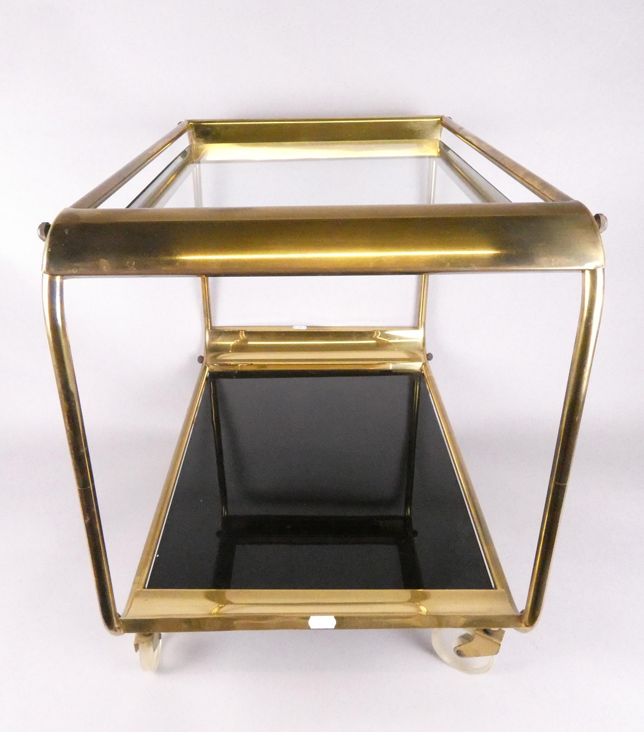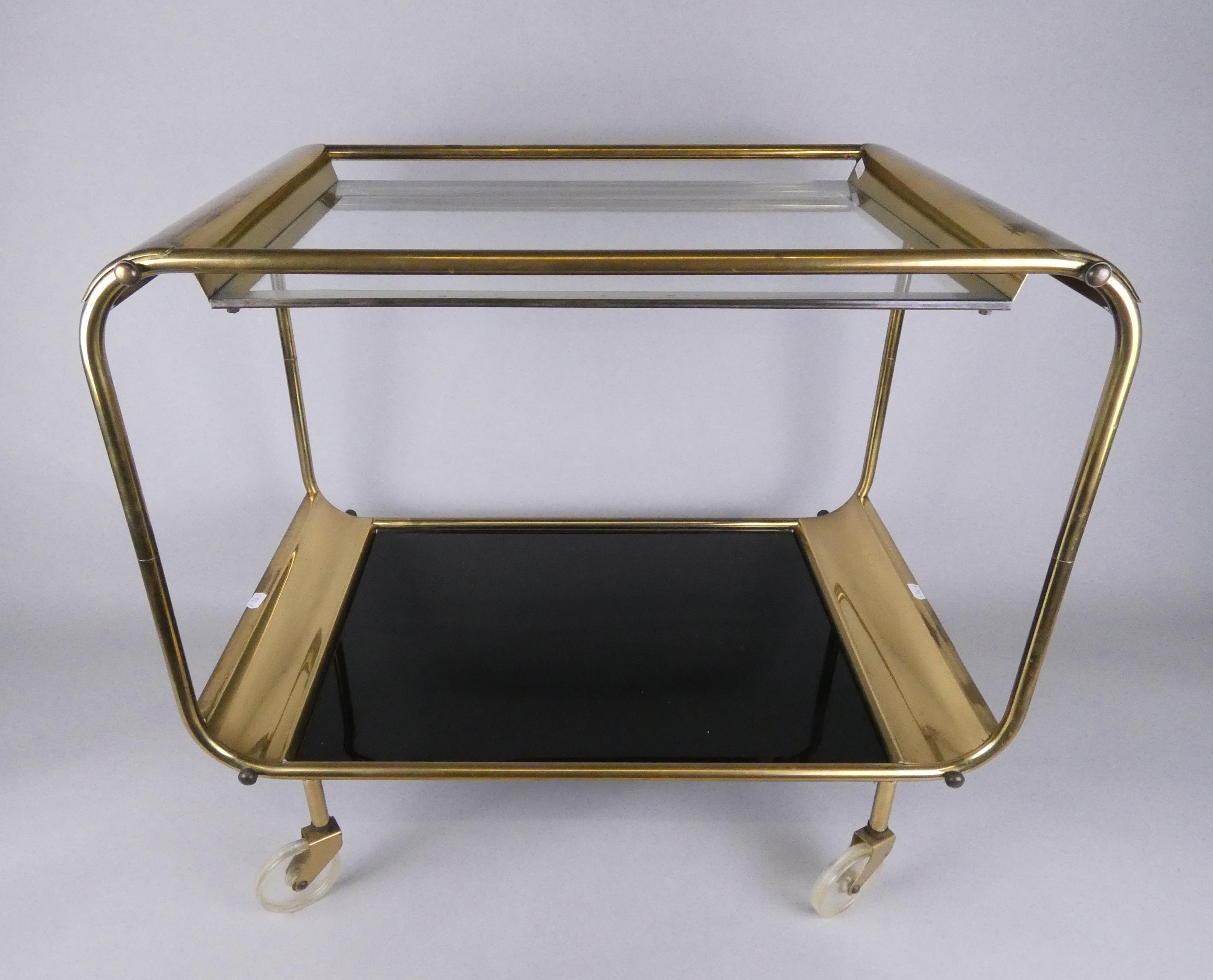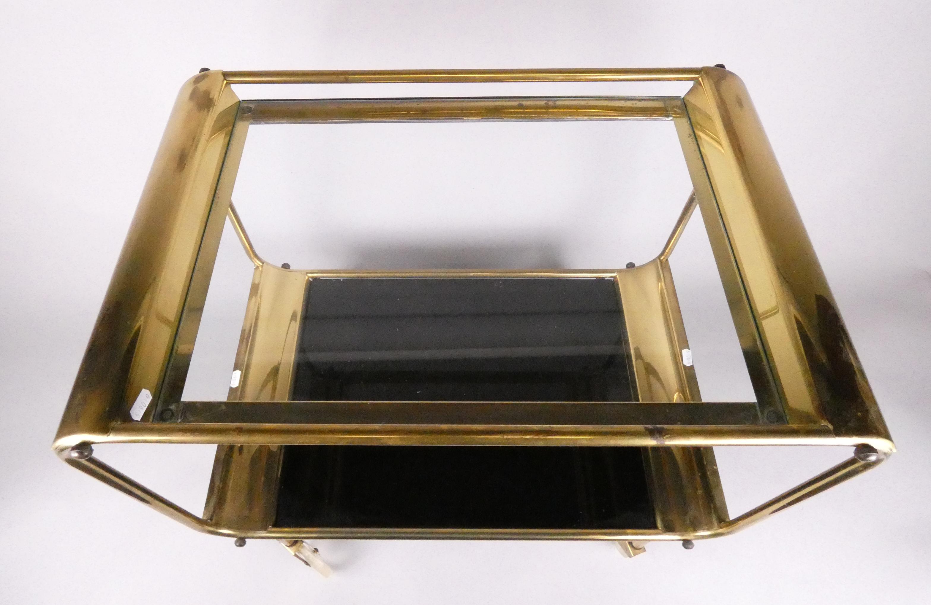 Meuble: Desserte en laiton doré (traces d'usures) et vitres en verre fumé 58x67x43,5cm
