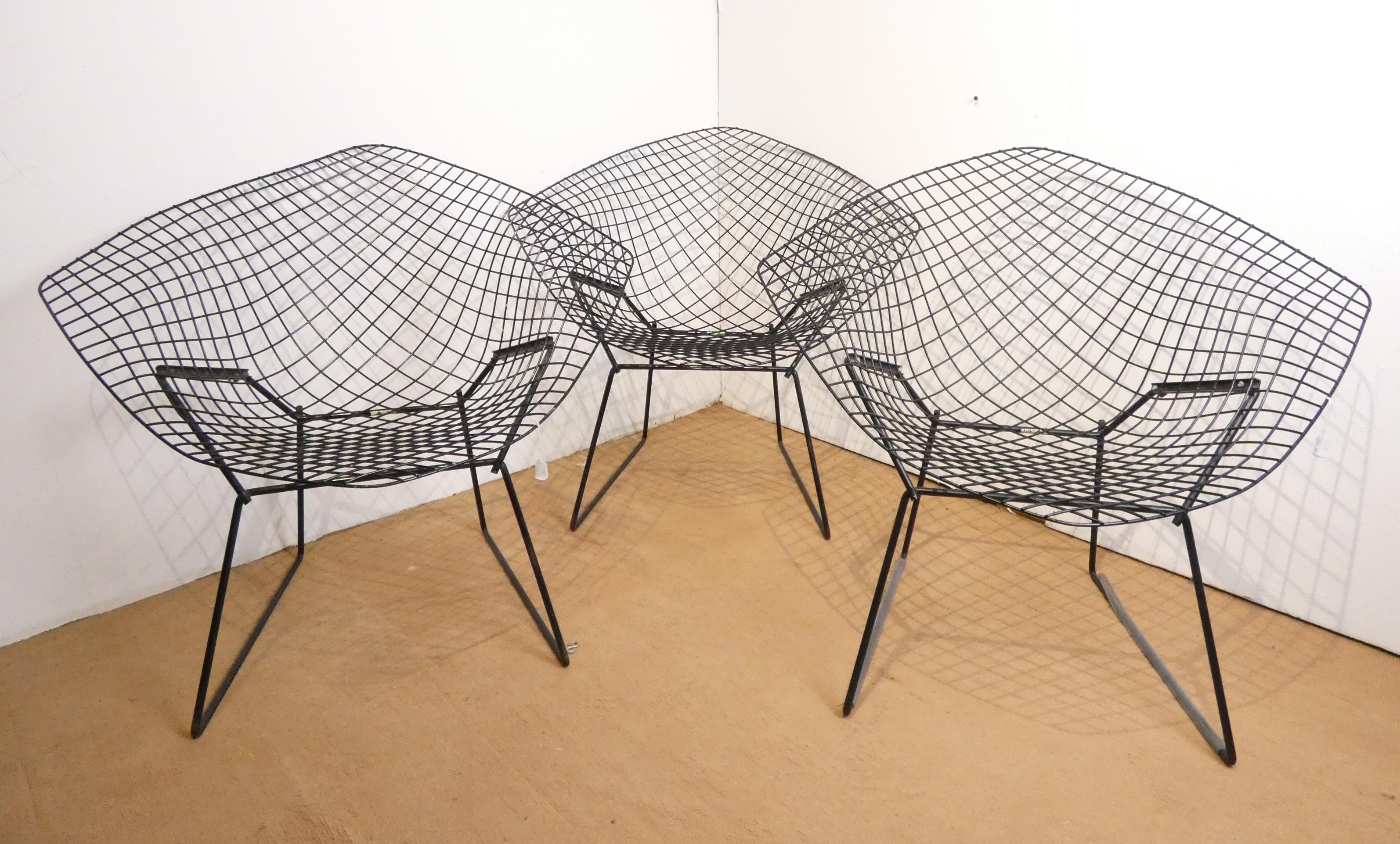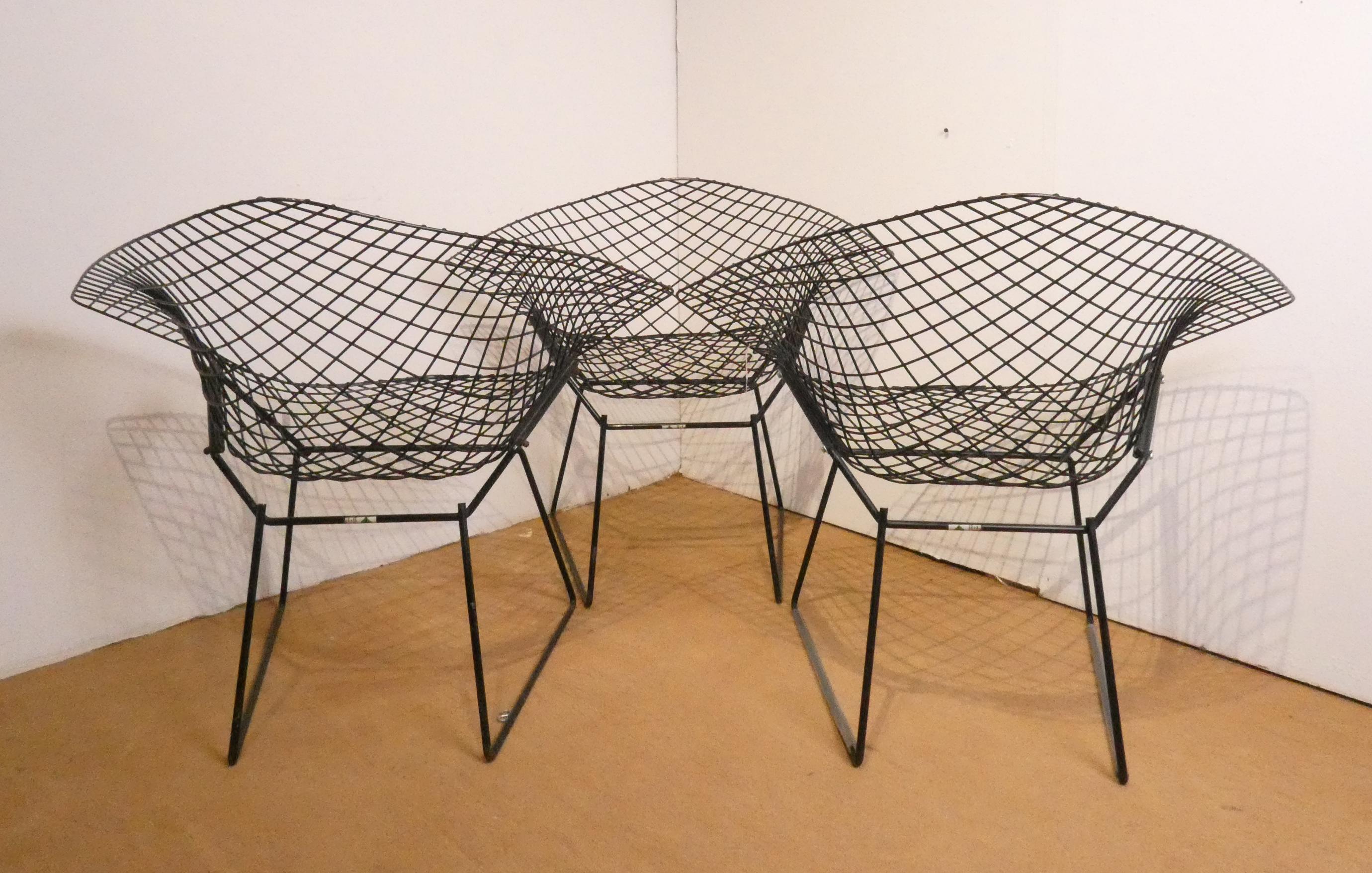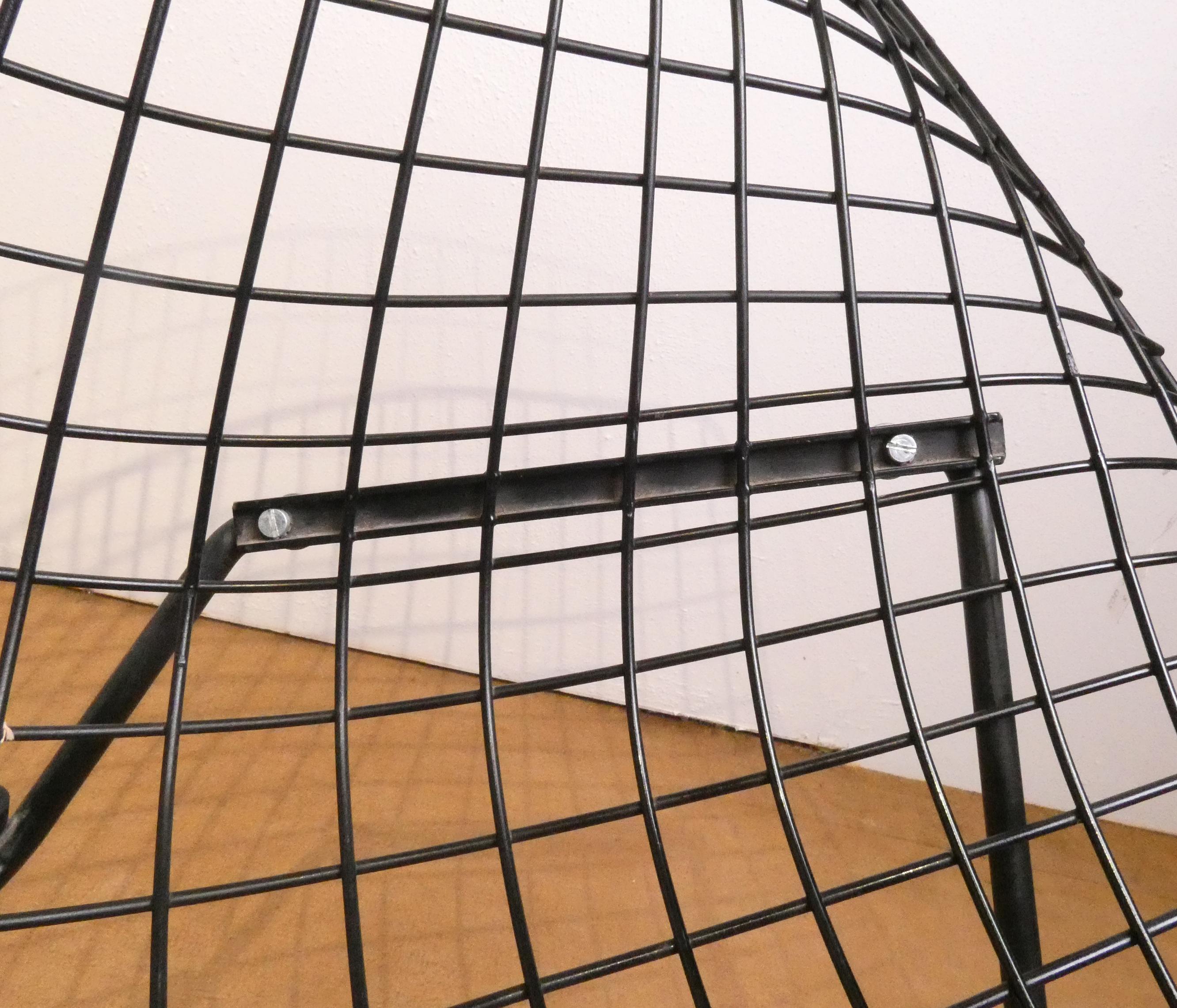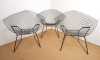 Meuble: 3 fauteuils en acier laqué noir (pt oxy, certaines vis remplacées) modèle -DIAMOND- designer *BERTOIA H.* (Harry) (1915, 1978) étiquette de l'éd. KNOLL INTERNATIONAL 75x85x