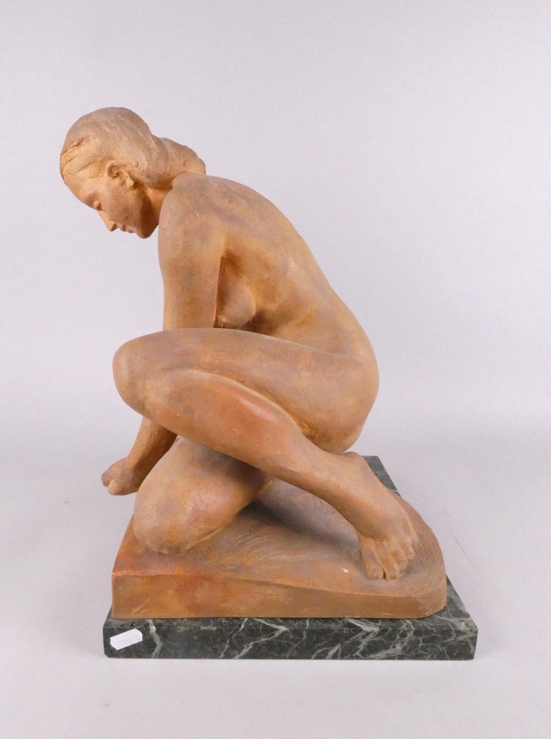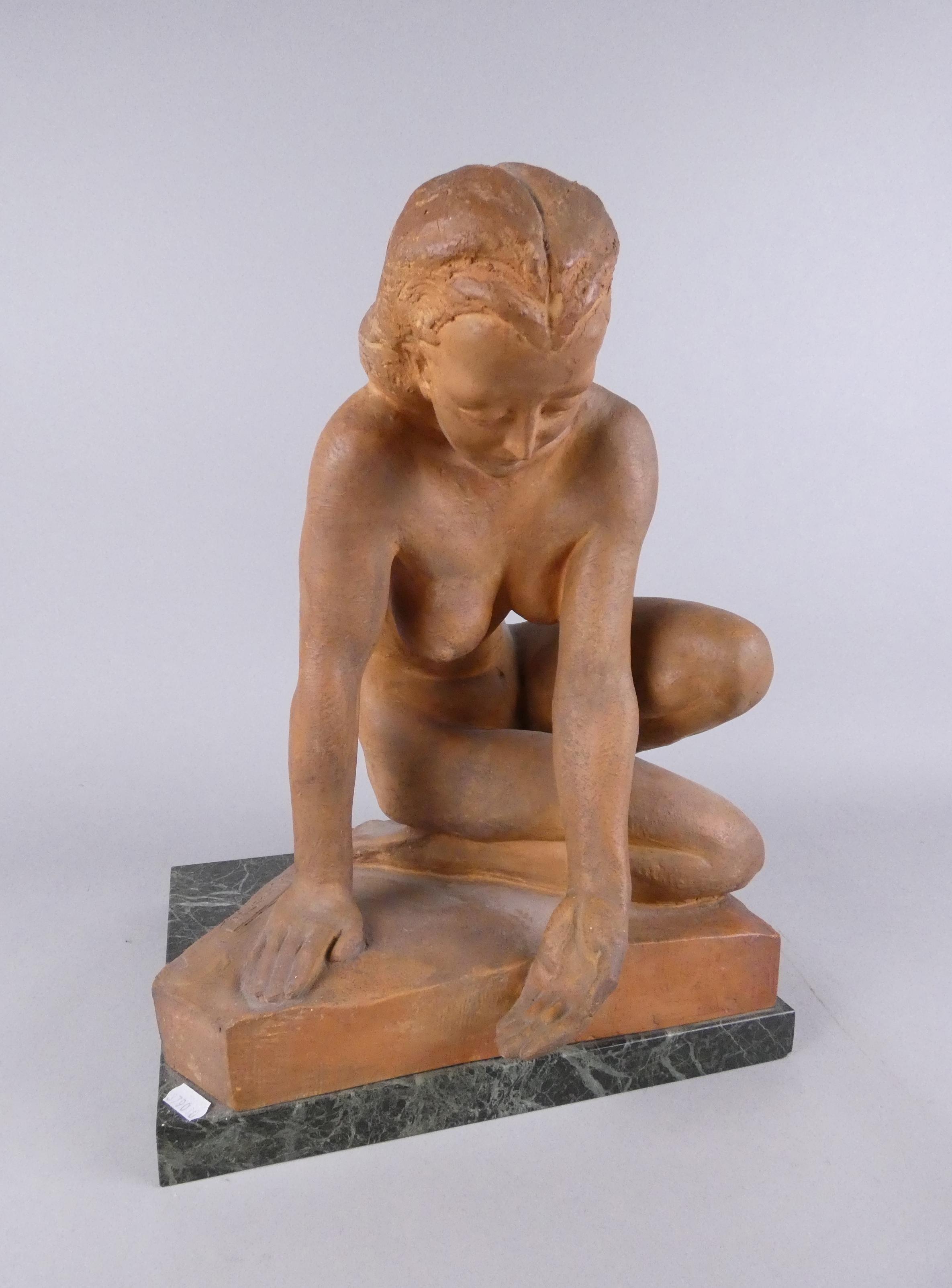 Sculpture: Terre cuite -Femme nue accroupie- signé *BOSMANS F.* (François) (1908, 1977) 41x33x29cm sur socle en marbre