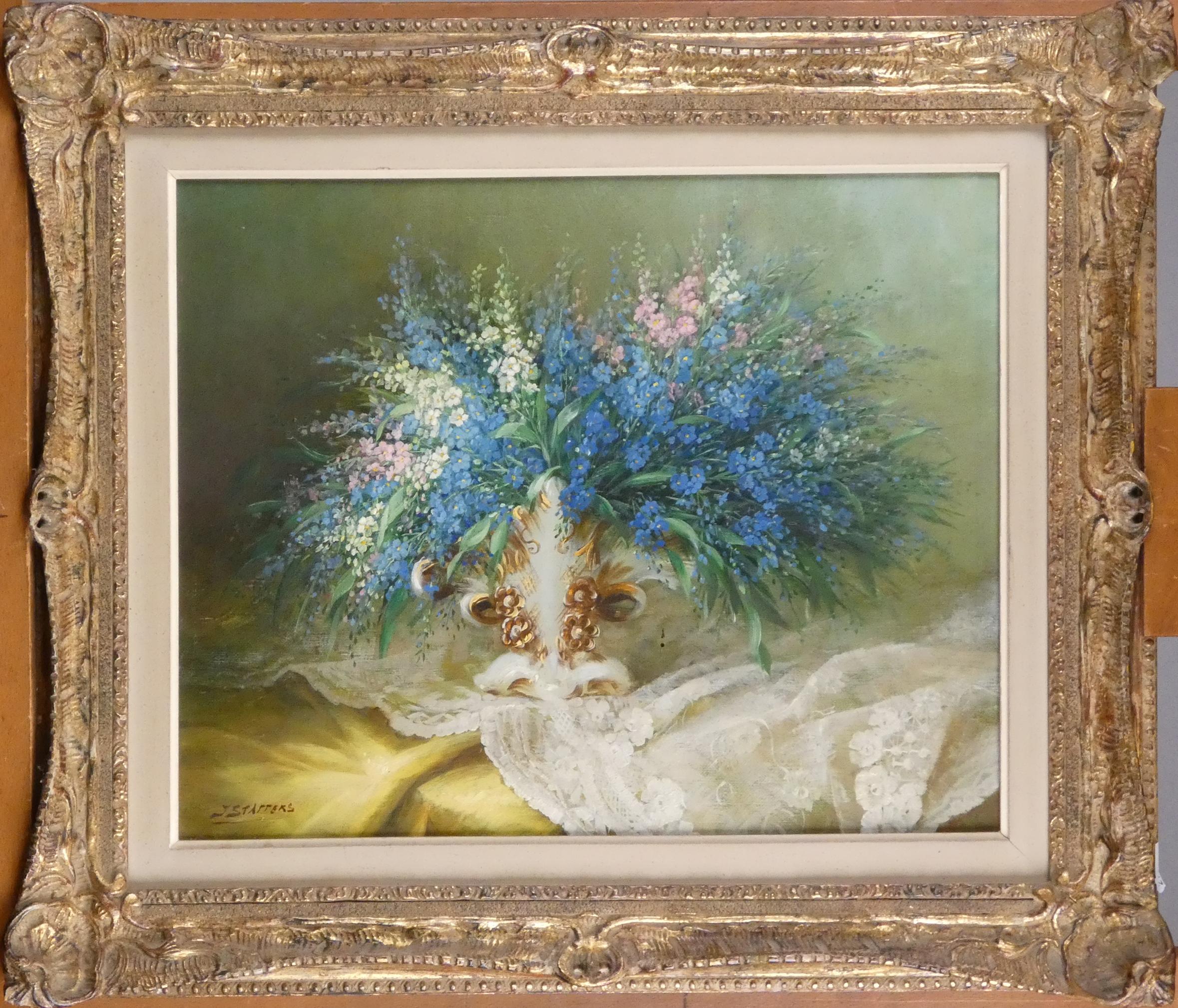 Tableau HST -Nature morte au cornet en fleurs- signé *STAPPERS J.* (Julien) (1875-1960) 33x41cm cadre de style doré (lacune)