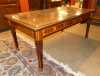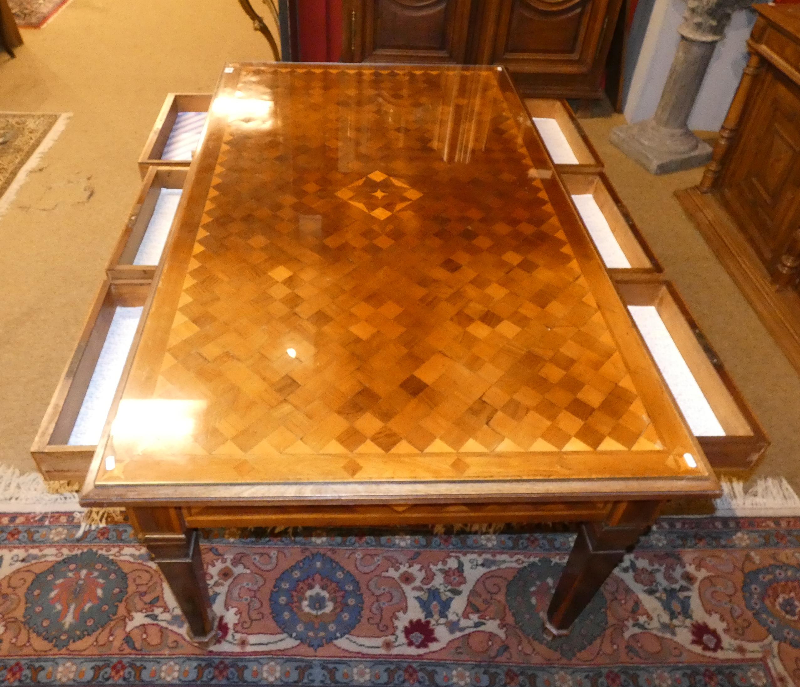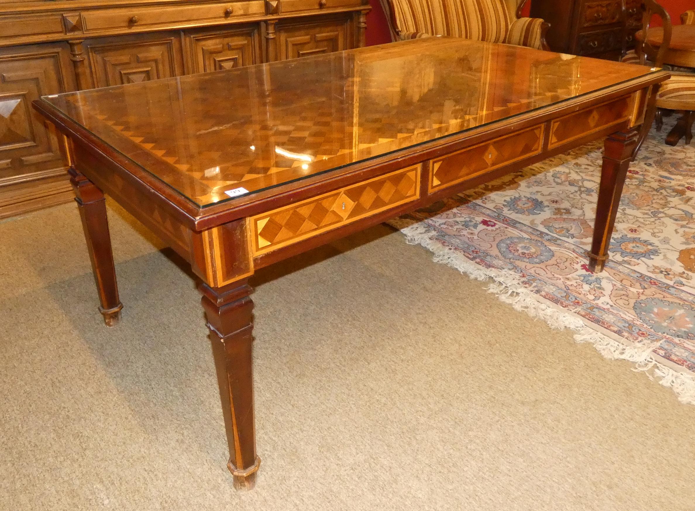 Meuble : Bureau plat rectangulaire double - face (usure d'usage) en bois à décor de marqueterie dessus vitré (rayures , pt ecl)