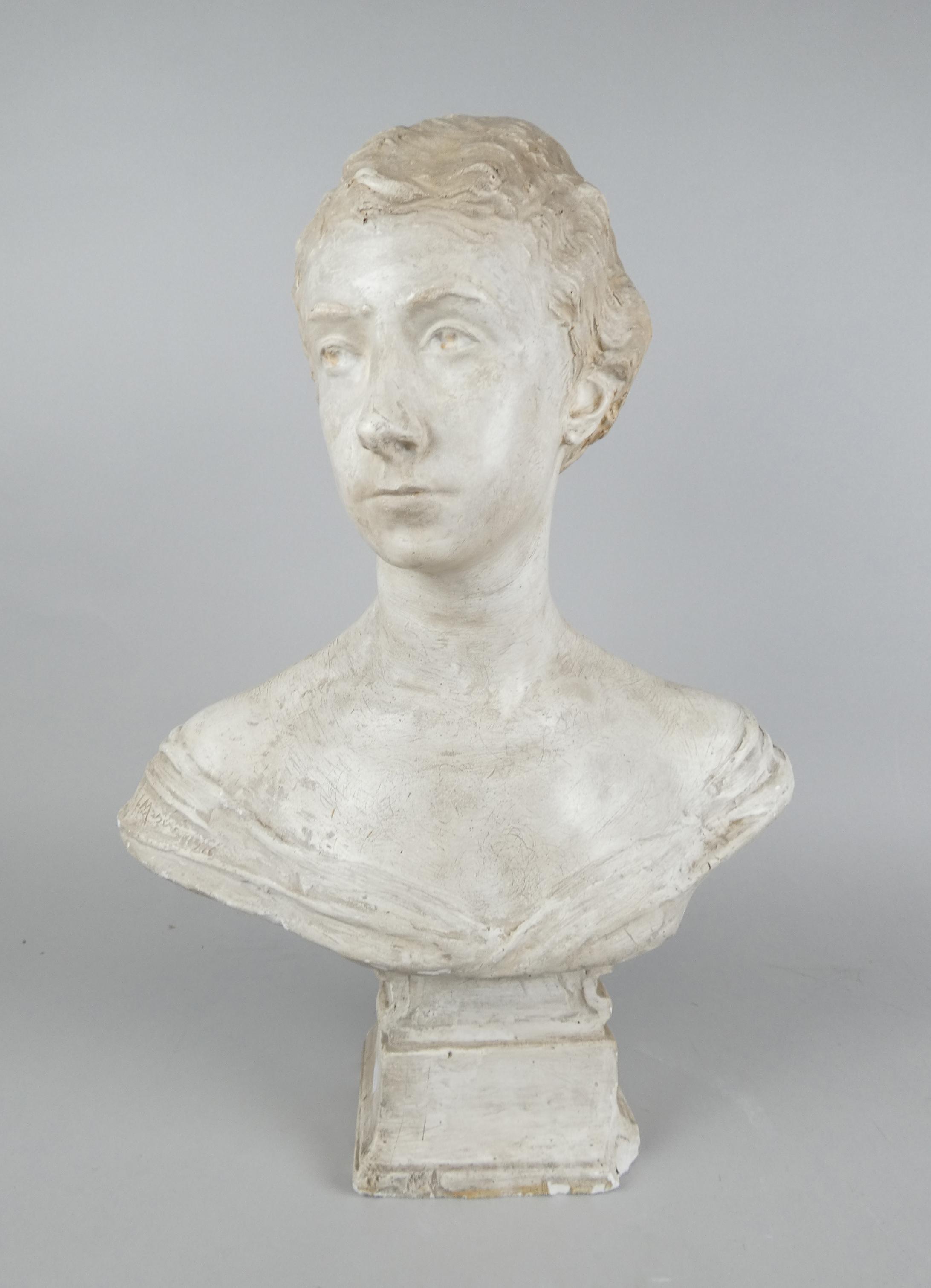 Sculpture: Buste de femme en plâtre (usure, ecl) daté 1916 signé *MASCRE L.* (Louis) (1871, 1929) H:60,5cm