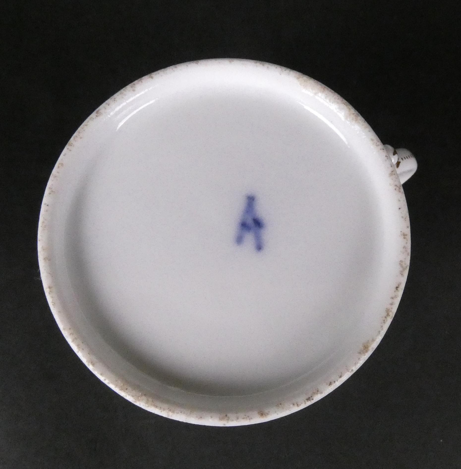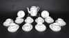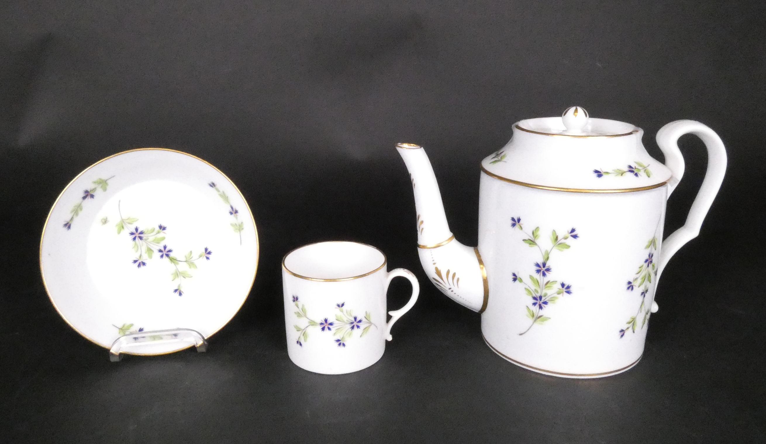 Céramique: théière (1 pt ecl), 10 tasses et sous-tasses en porcelaine décor au barbeau fin 18eS (13pcs)