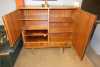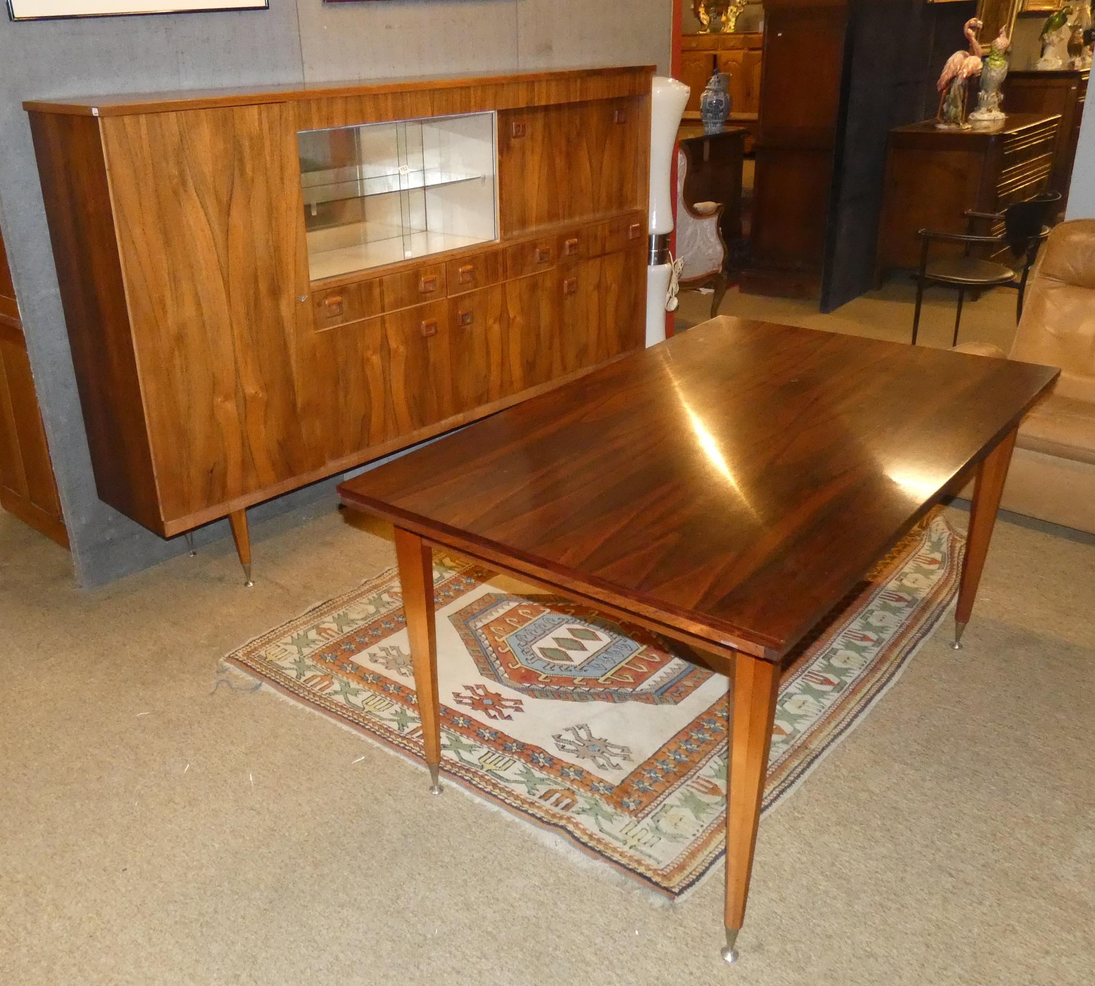 Meuble: Salle à manger vintage en palissandre sur pieds métal chromé circa 1960 : Bahut vitrine, petit meuble , table allongeable