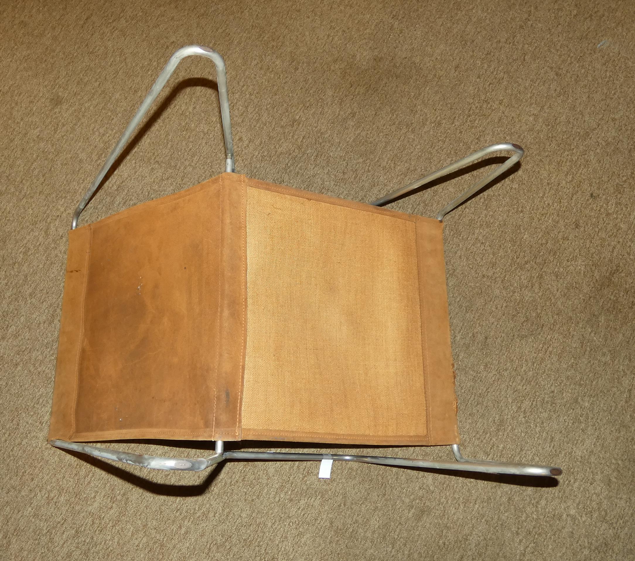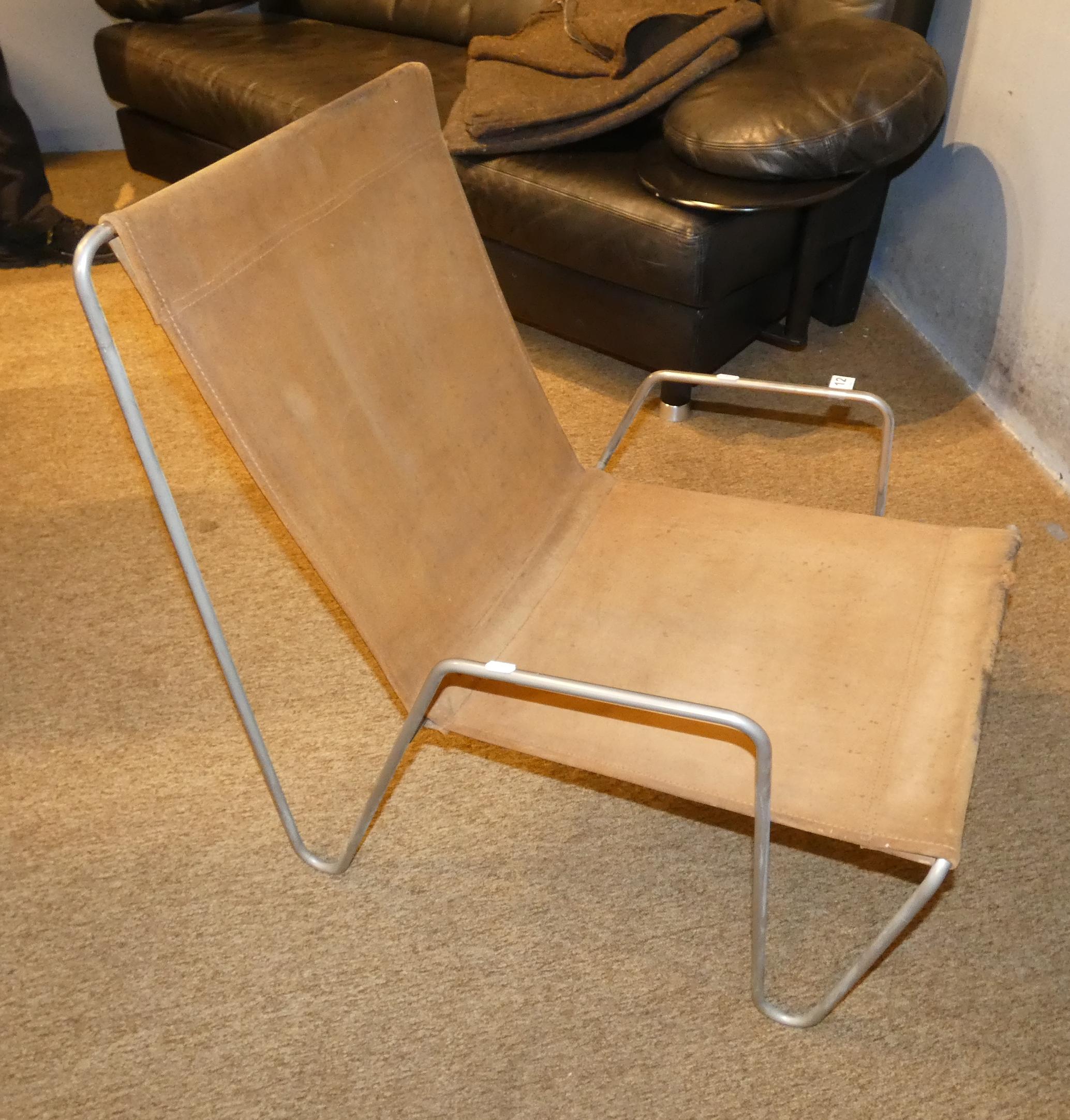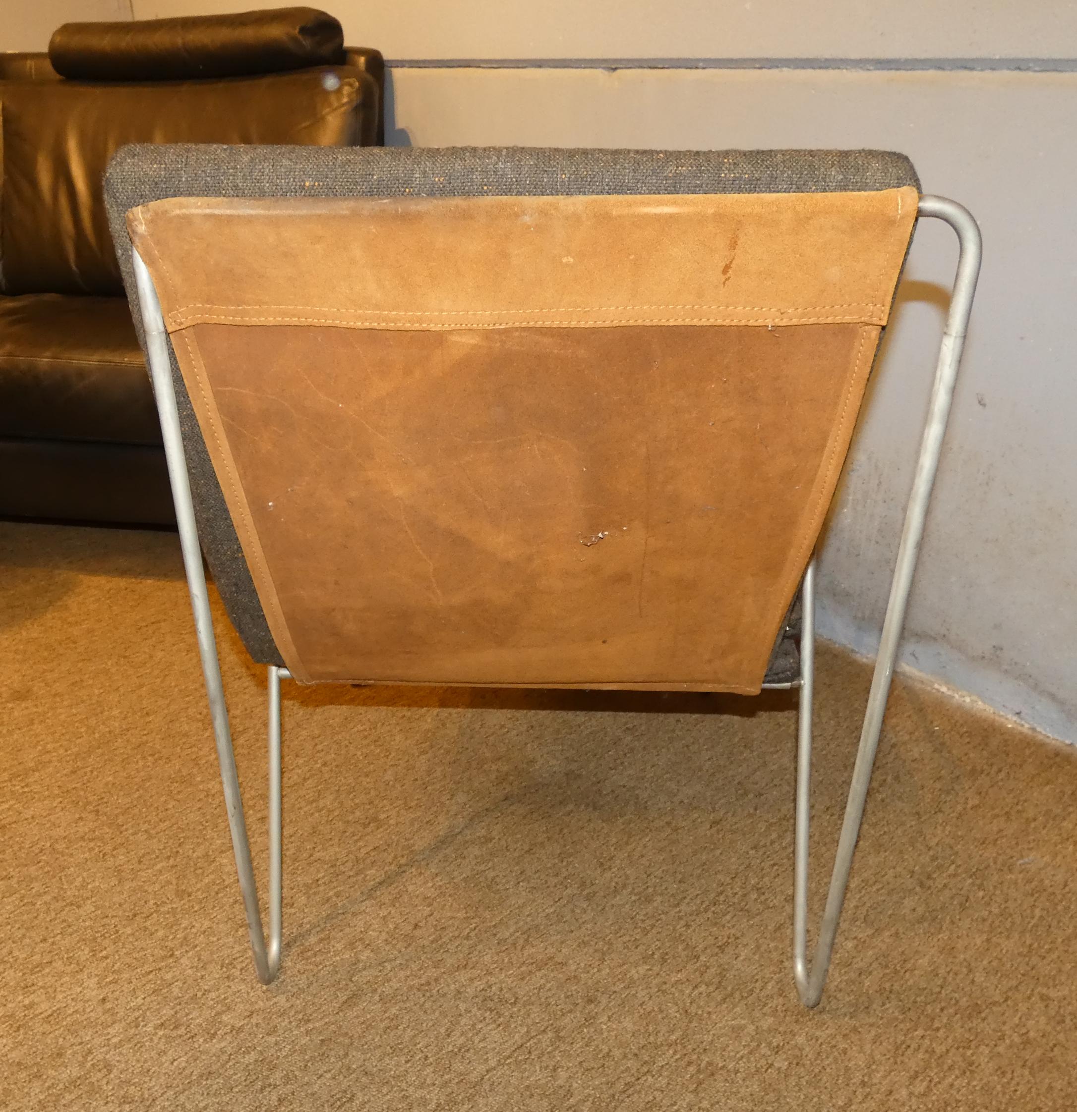 Meuble: Fauteuil modèle -BACHELOR- en acier chromé et daim (usure importante par endroits, taches) circa 1955 attribué à *PANTON V.* (Verner) (1926, 1998) éd Fritz HANSEN
