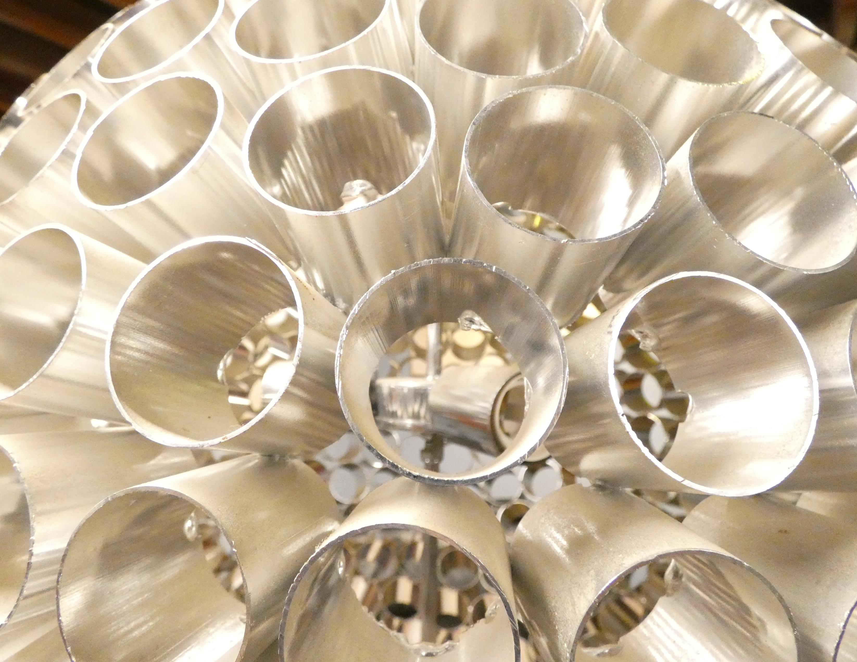 Luminaire: Lustre sphérique à 3 lumières de type Space Age composé de tubes en aluminium Diam:50cm