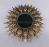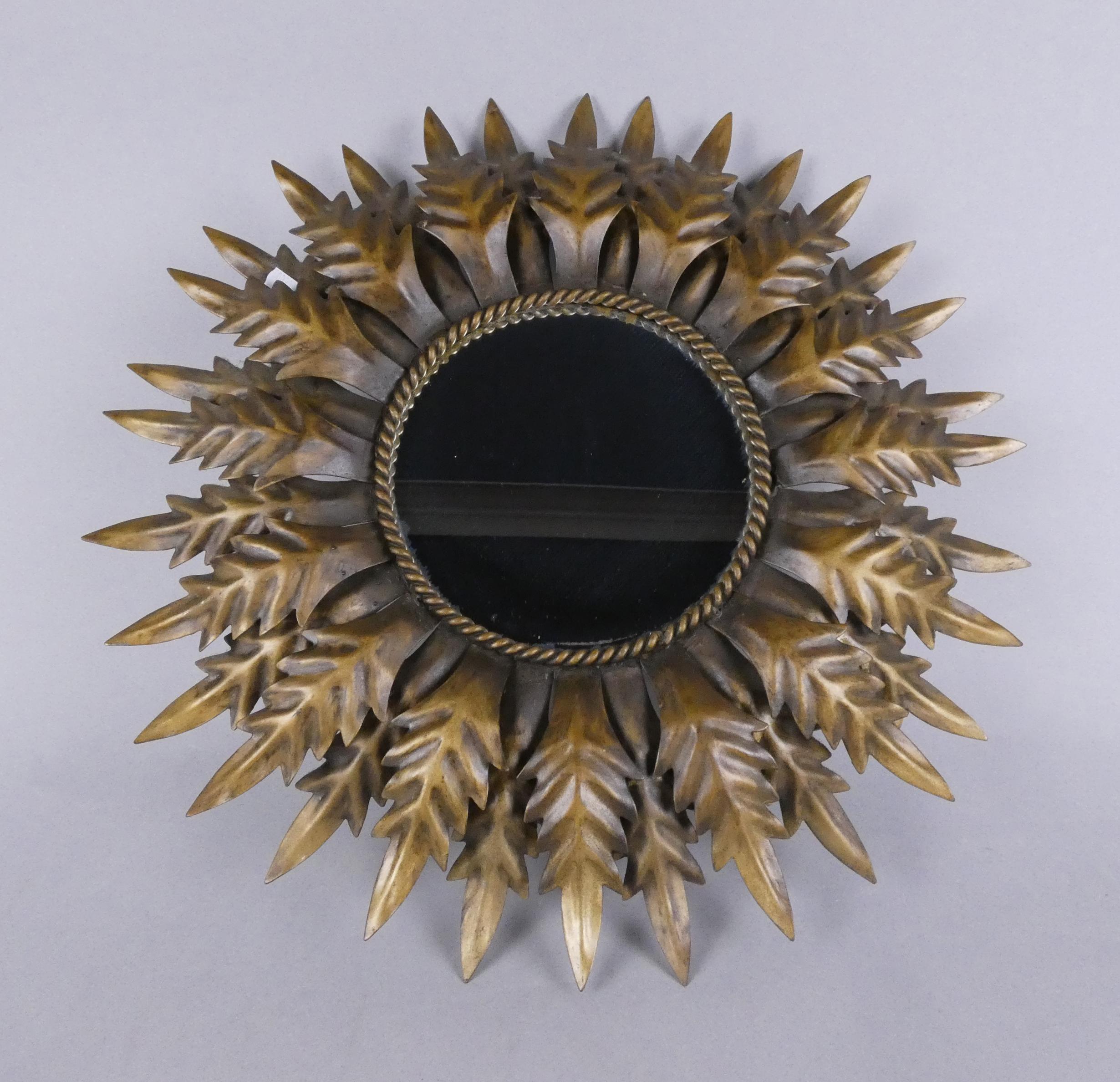 Meuble: Miroir dit soleil rond en métal argenté patiné dans un entourage de feuilles Diam:53cm