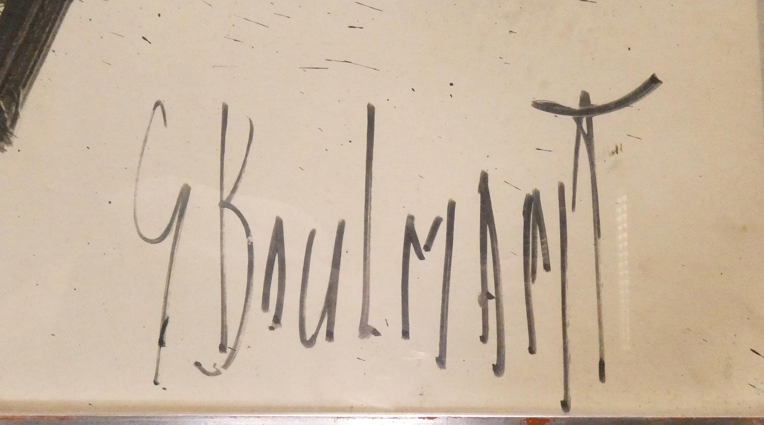 Tableau: technique mixte/collage (taches) -sans titre- signé *BOULMANT G.* (Georges) (1914, 2004) 80x105cm cadre argenté sous verre
