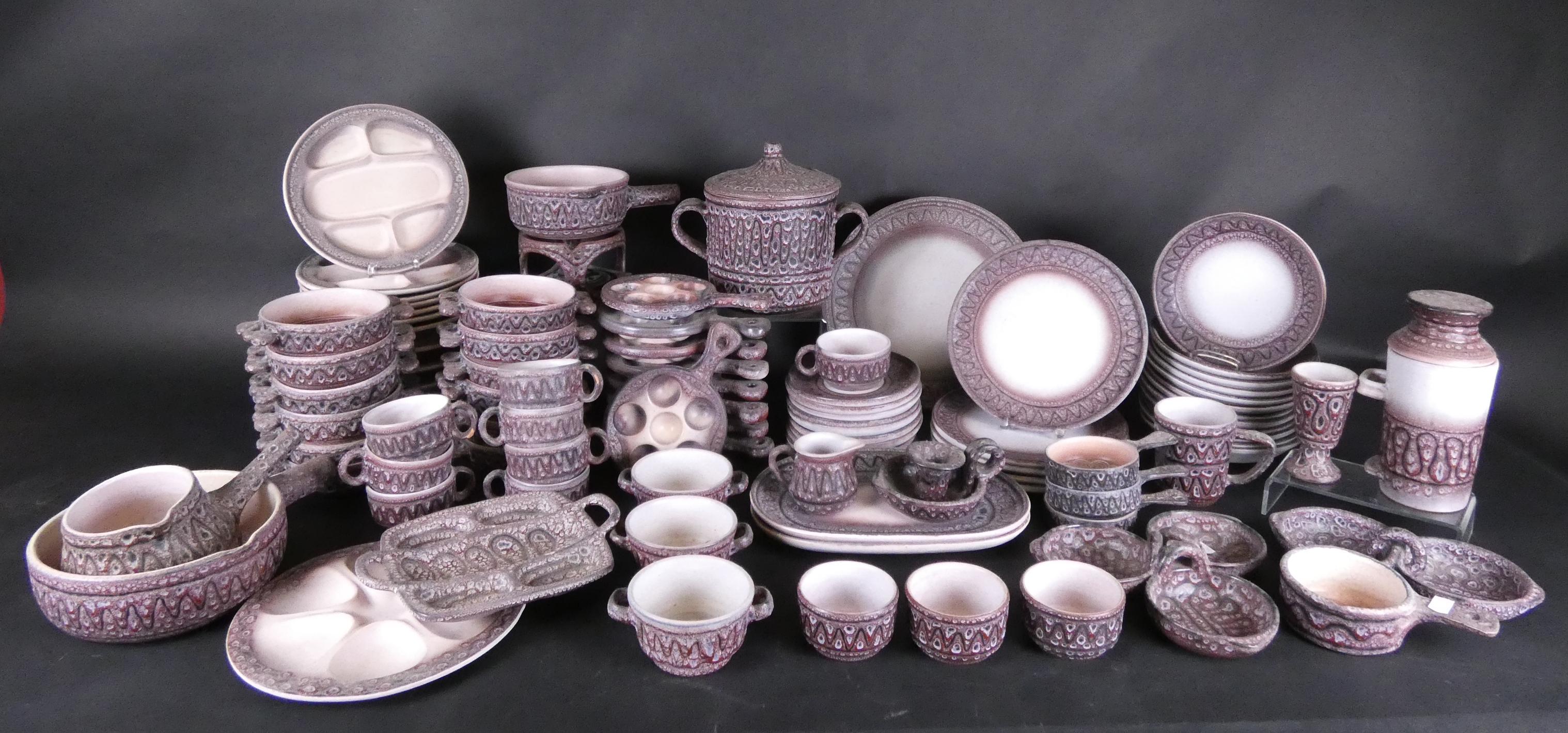 Céramique: Service à diner/à fondue en faïence signé (ecl, egr, chv) signé *AUSTRUY J.* (Jean) (1910, 2012) (+/-90pcs) dont: assiettes à fondue