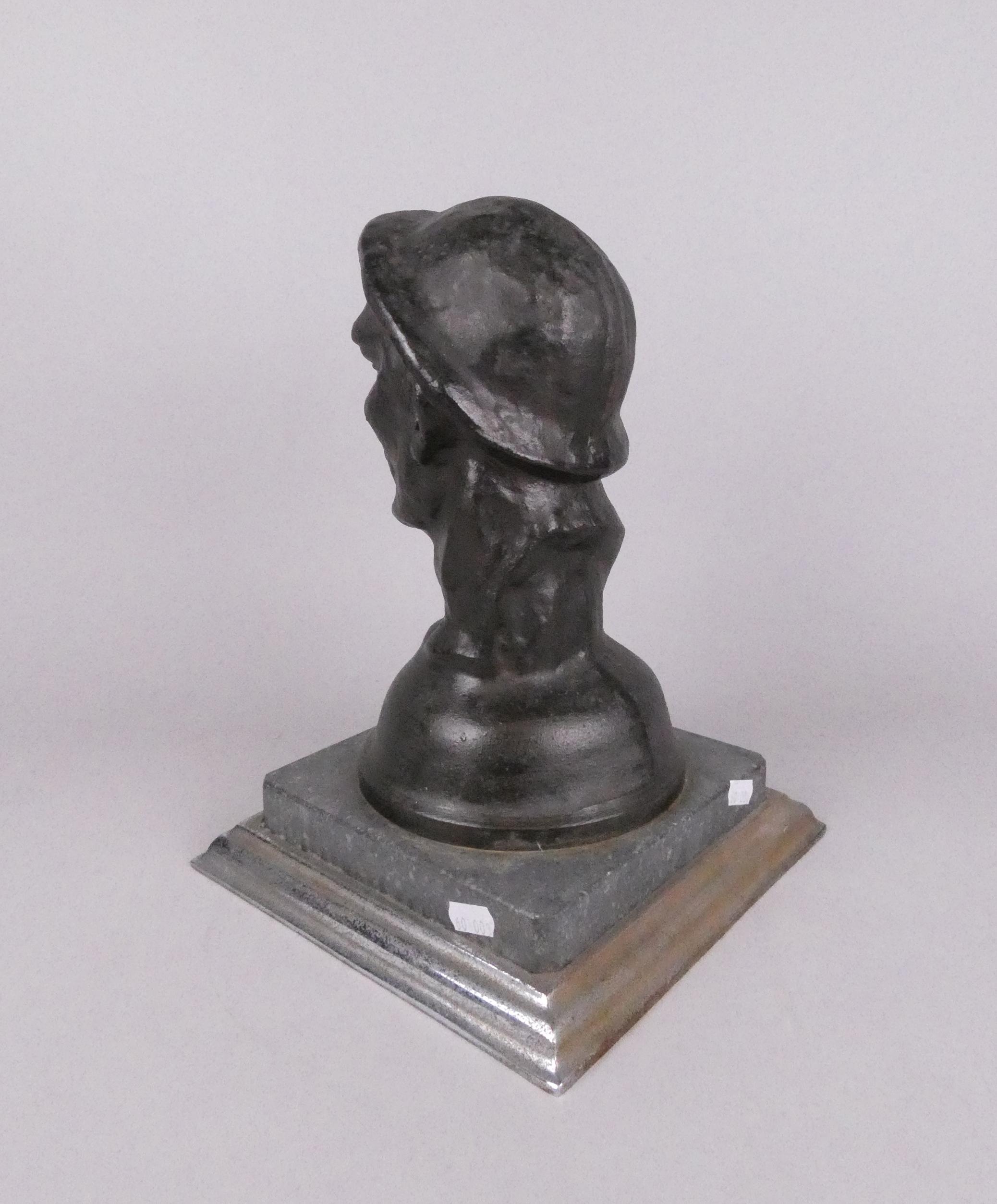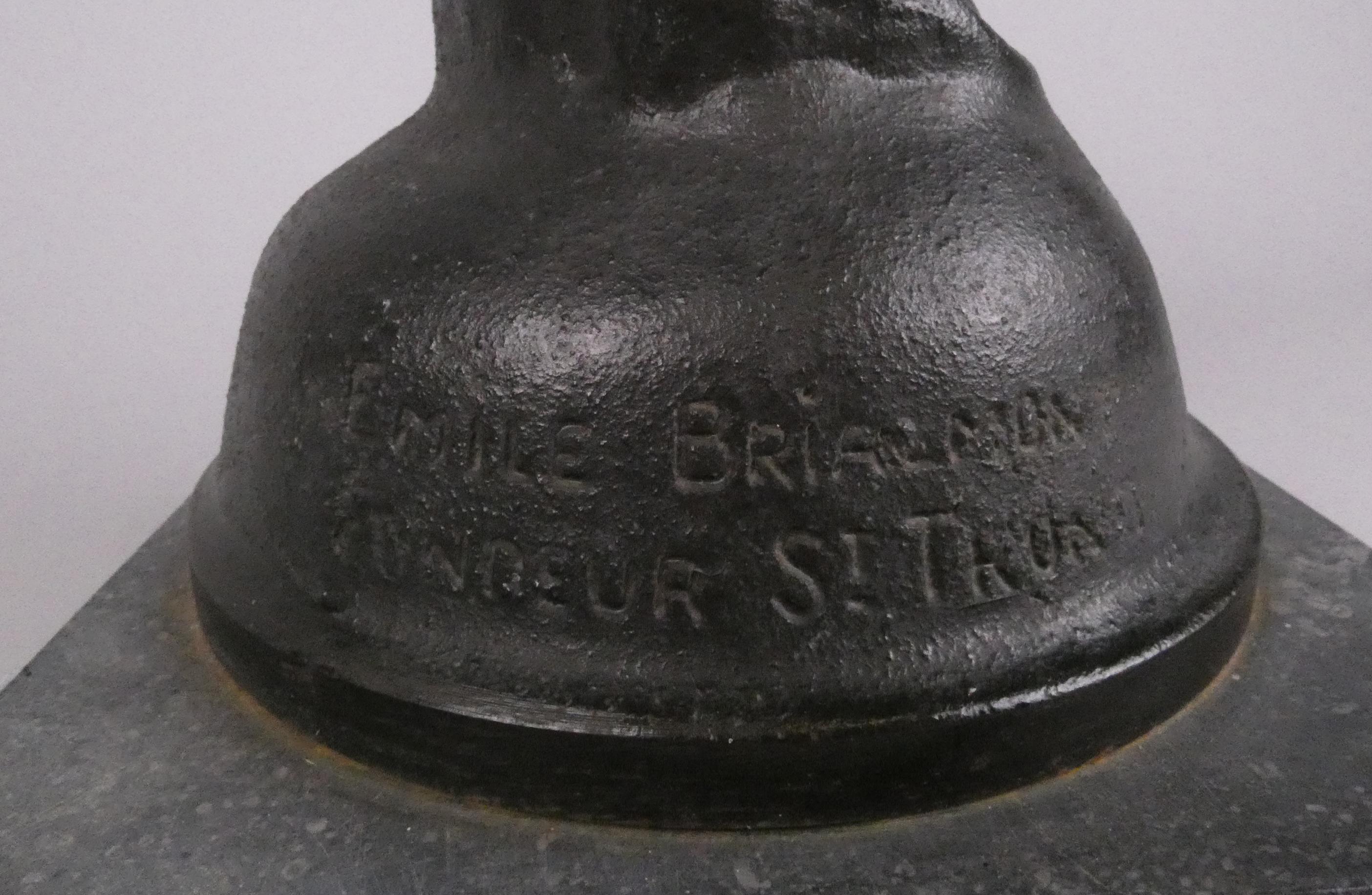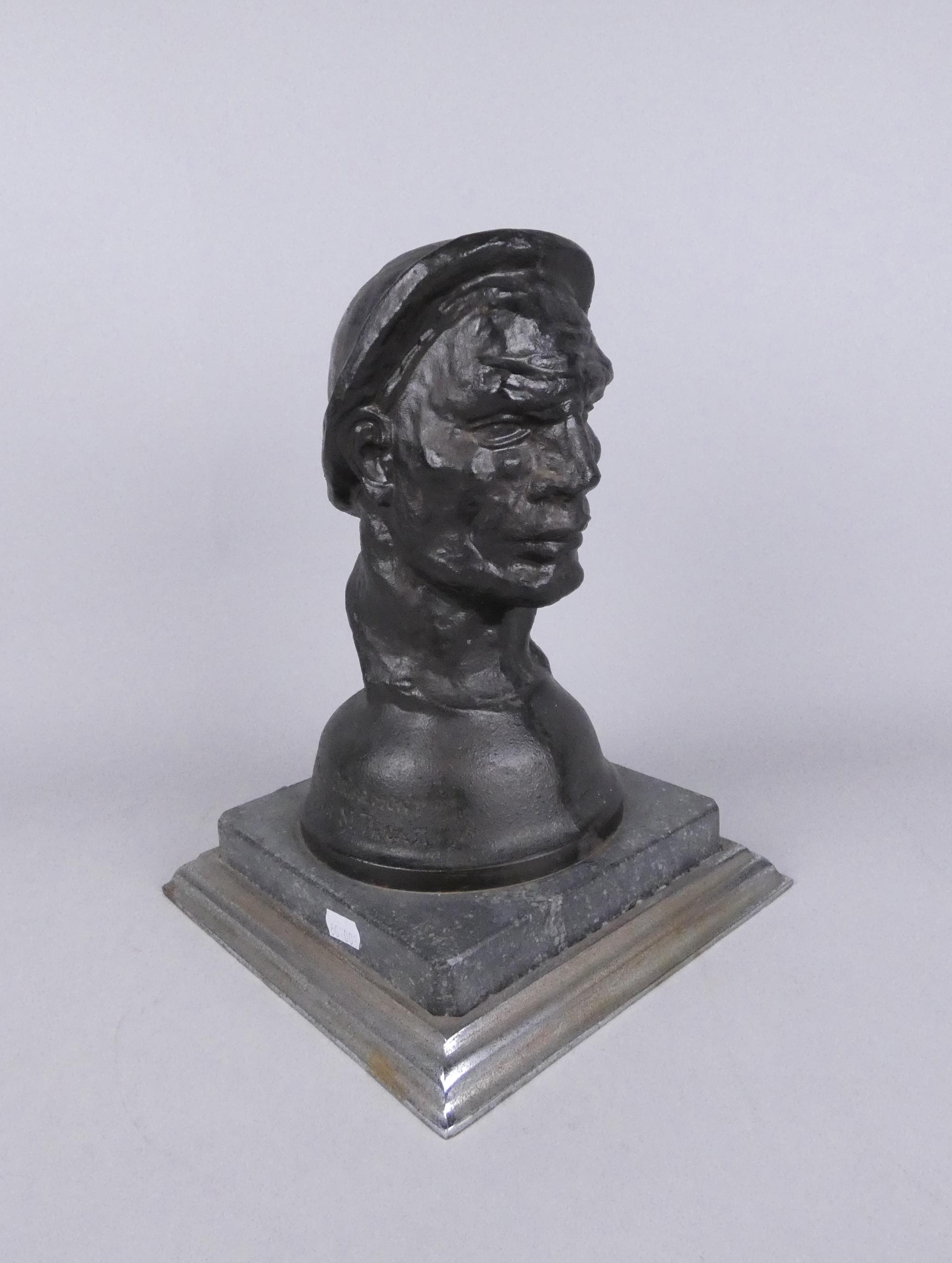 Sculpture: fonte patinée -Tête de mineur- signé BRIALMONT Emile fondeur St Trond H: 29cm sur socle de marbre et métal