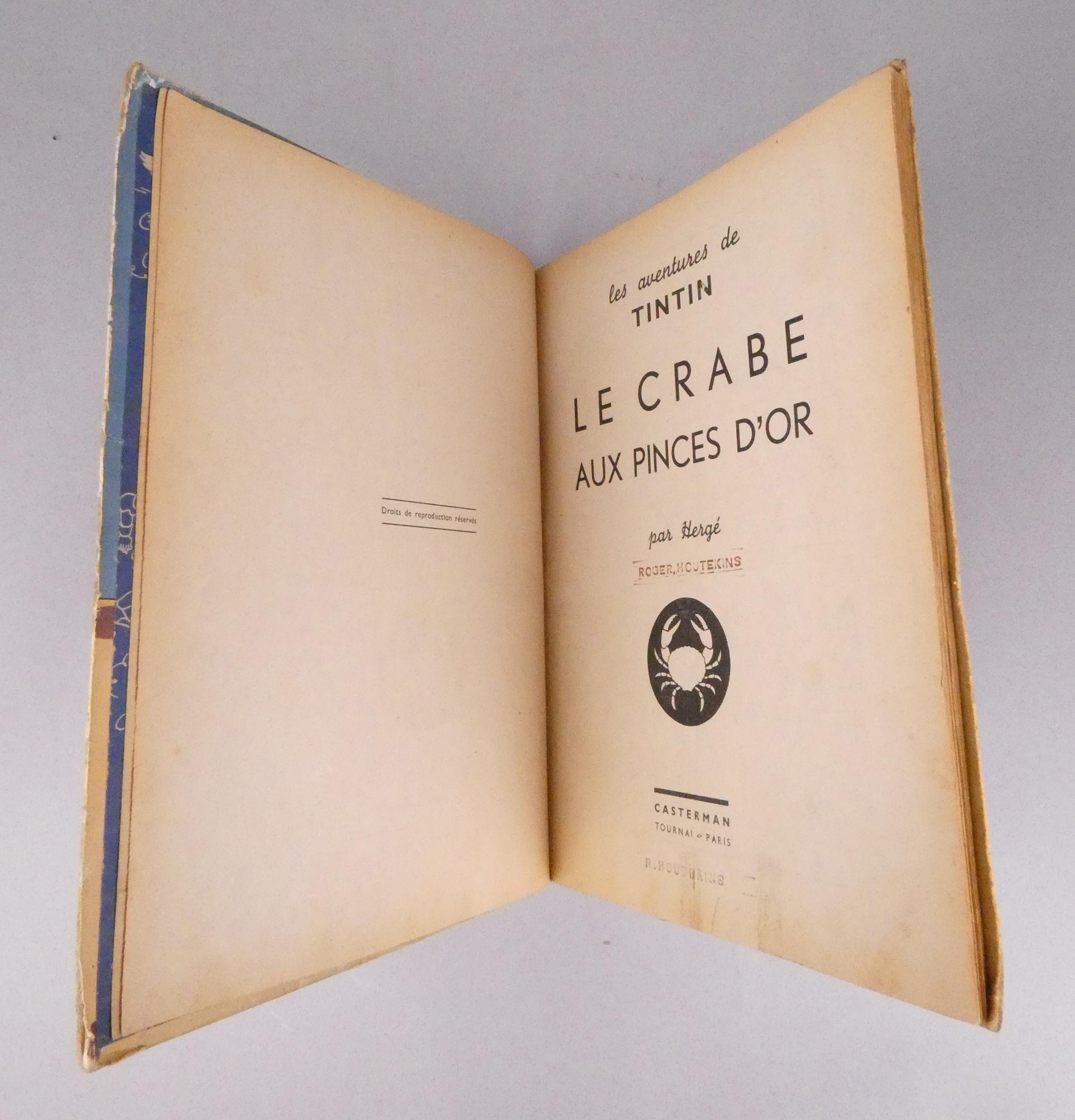 BD: Tintin HERGE éd CASTERMAN -Le crabe aux pinces d'or- (rest., déchi, acc, taches) A18 1942, paginé de 4-103, 4 HT coul., gardes bleu foncé (BDM26:4000_)