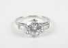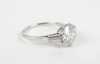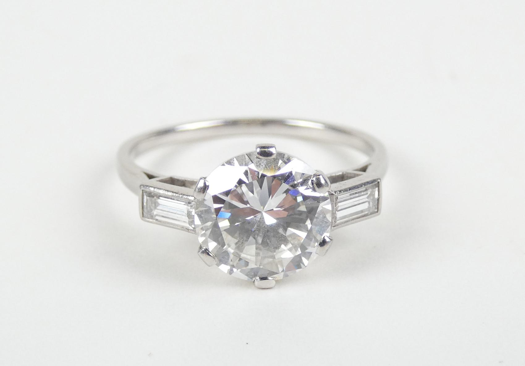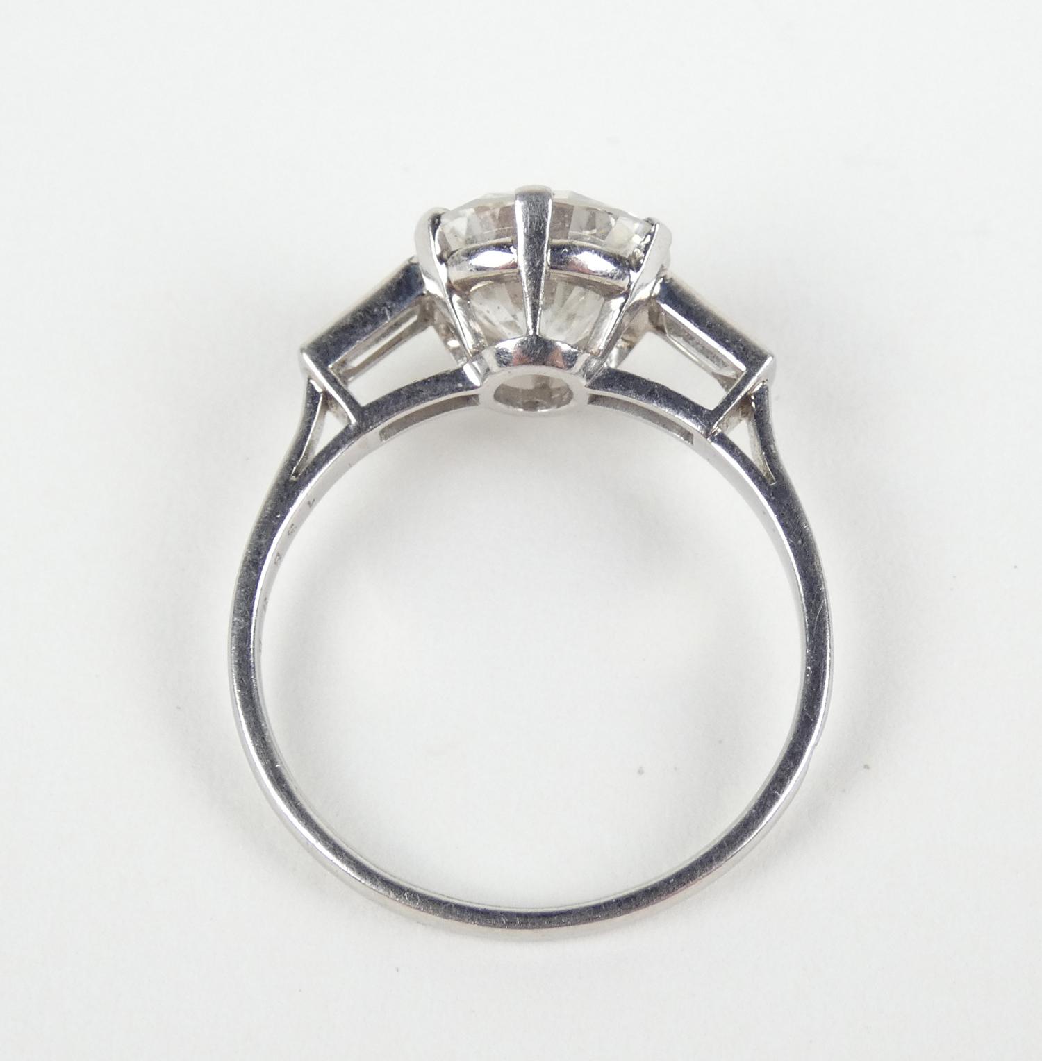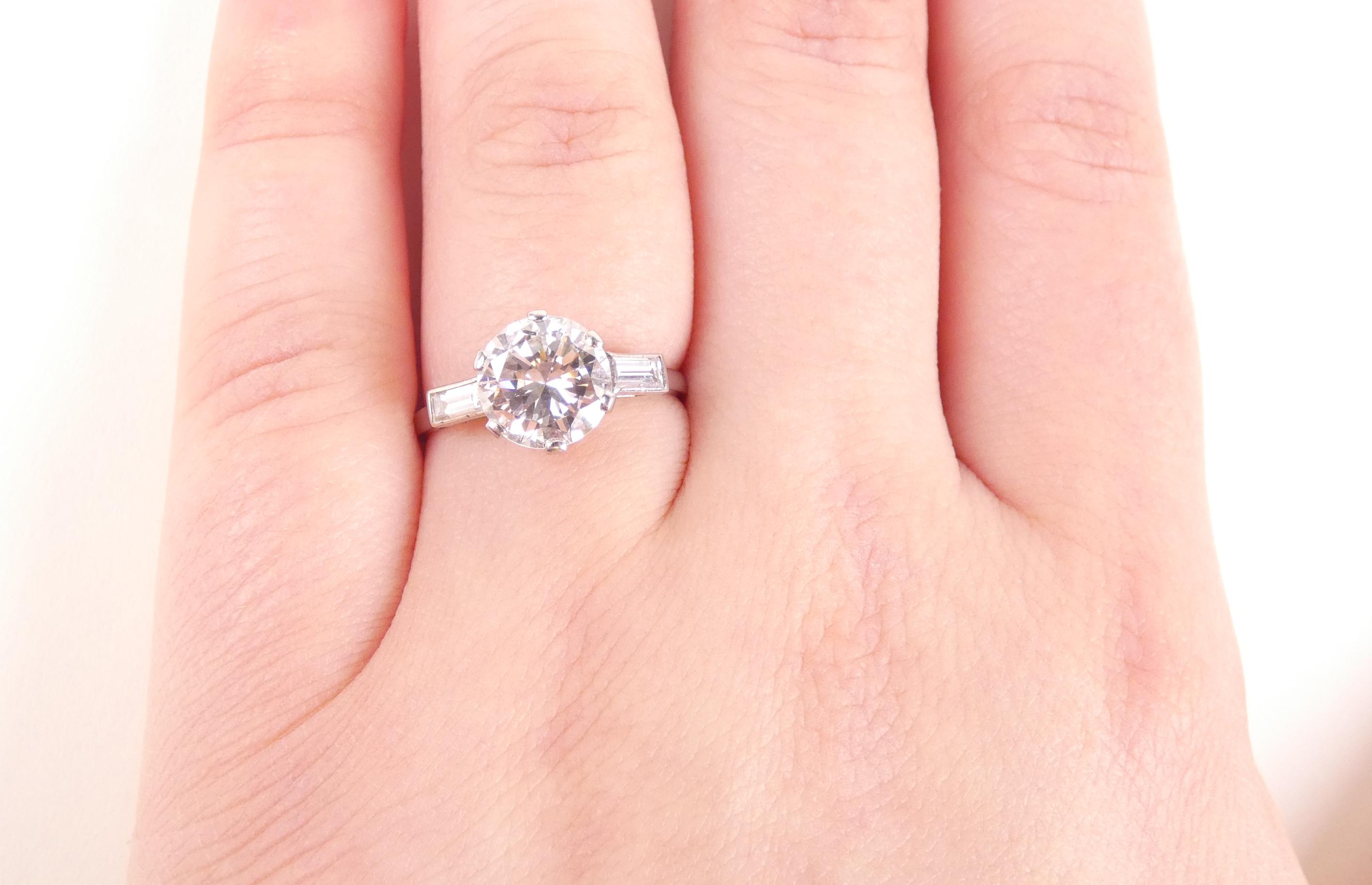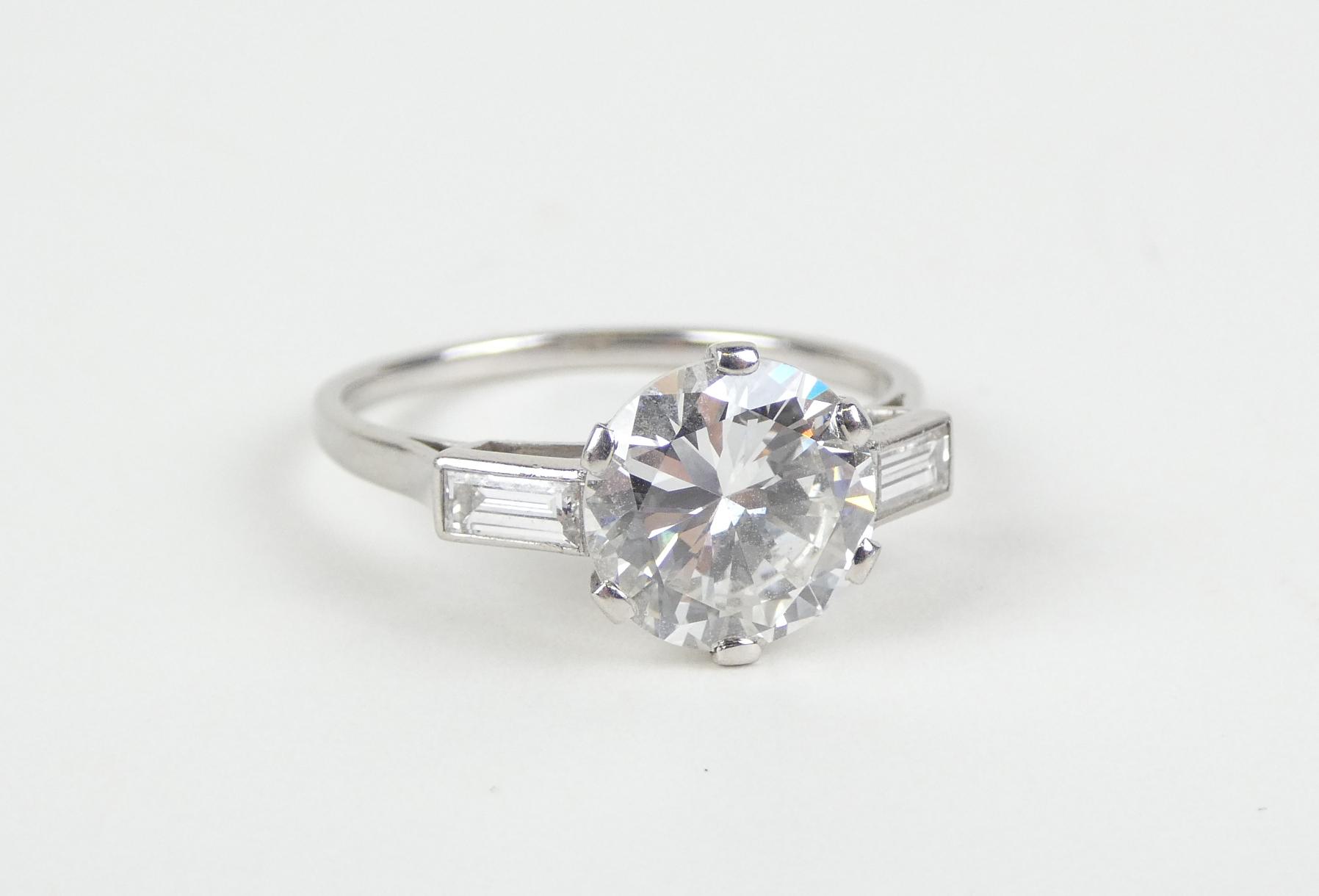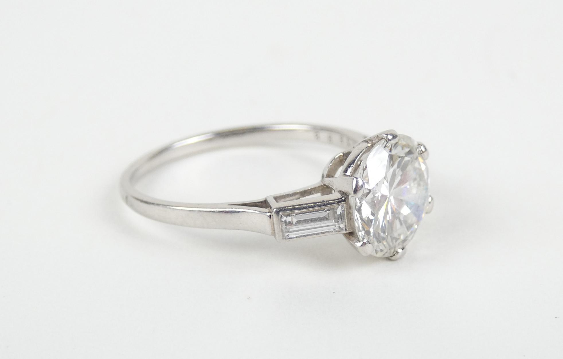 Bijou: Bague en platine sertie d'un diamant taille brillant de 2cts couleur F-G pureté VVS symétrie très bonne épaulé de 2 diamants baguette pour 0,20cts 2,9g avec certif HRD
