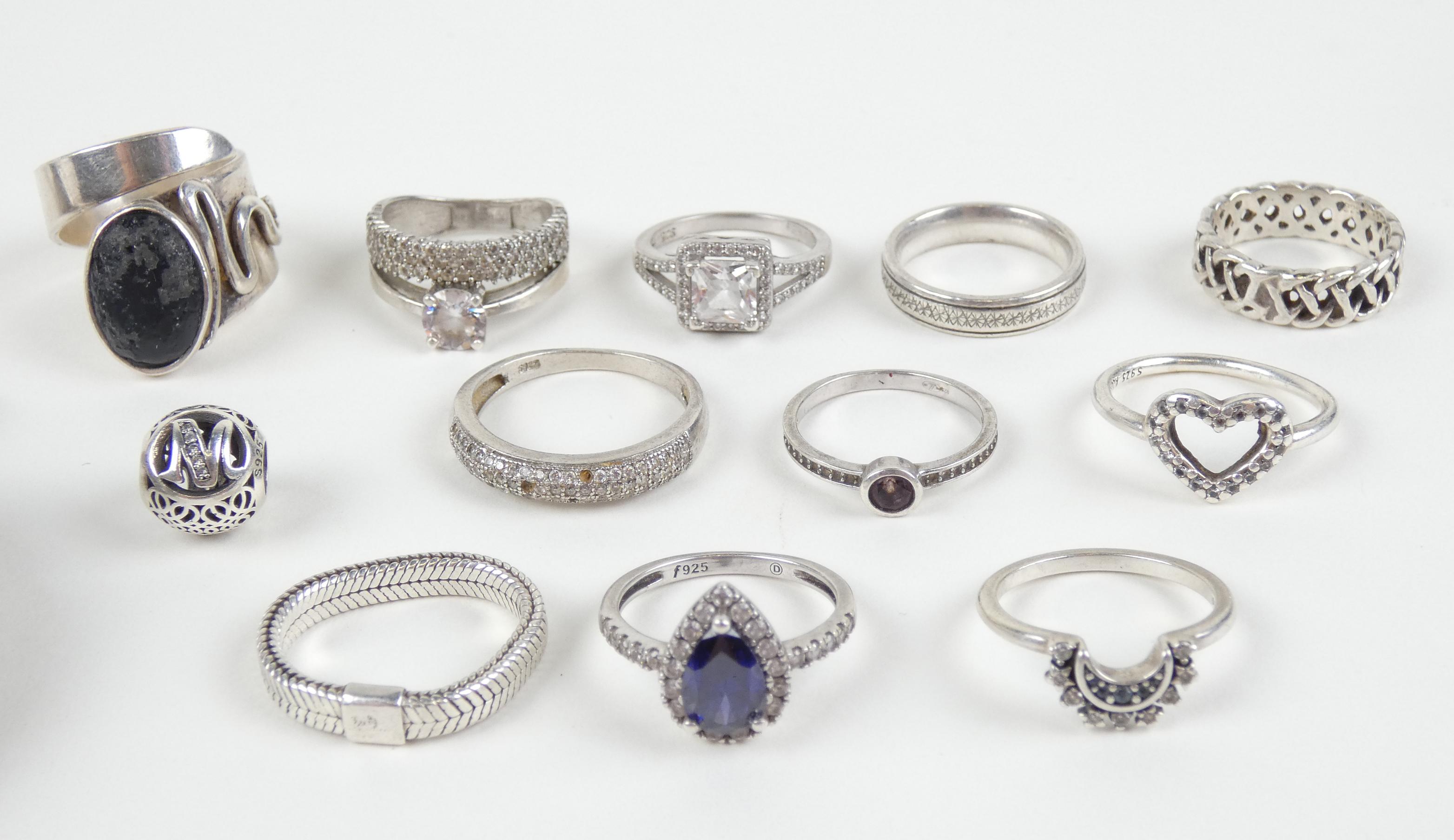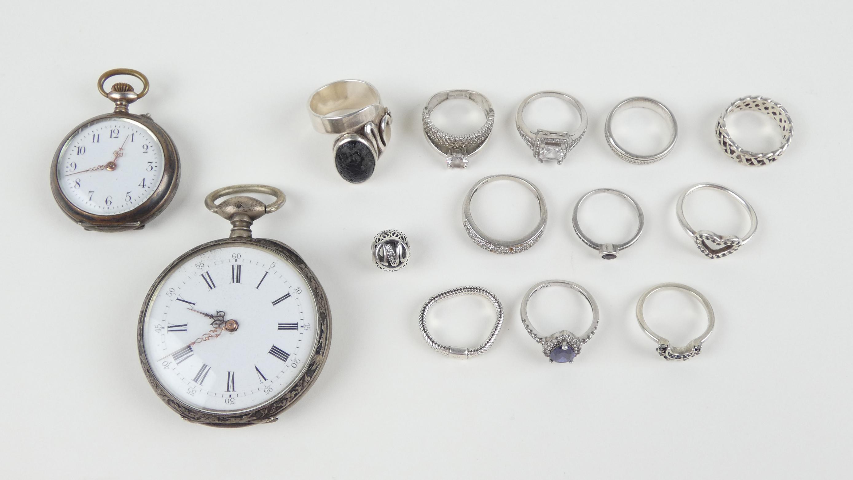 Bijou : 11bagues en argent (dont pandora) + perle en argent + 2montres de gousset (cuv ext et double cuv) en argent (ds l'état)