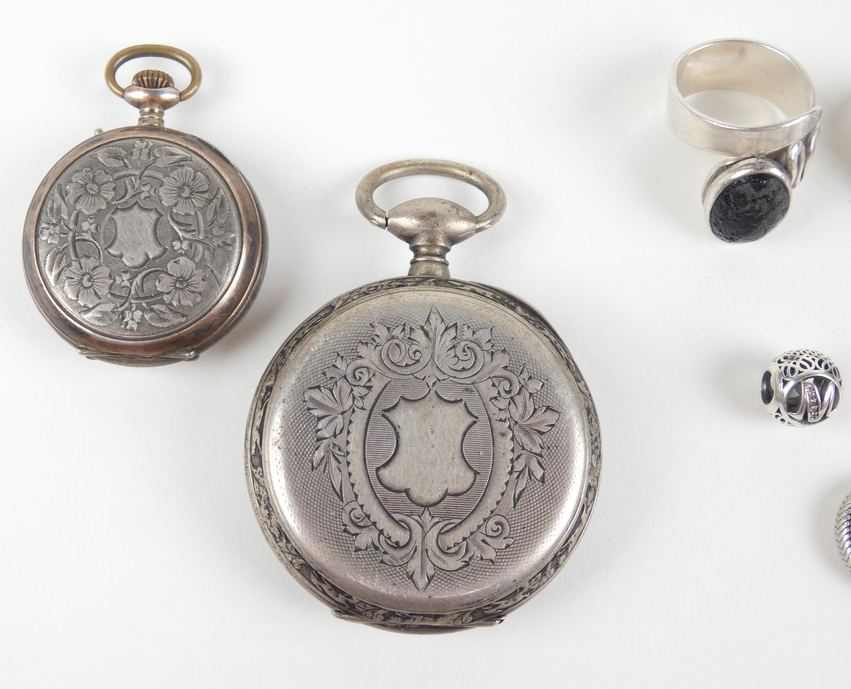 Bijou: 11bagues en argent (dont pandora) + perle en argent P: 39,2g + 2montres de gousset (cuv ext et double cuv) en argent (ds l'état) Pbrut: 105,7g