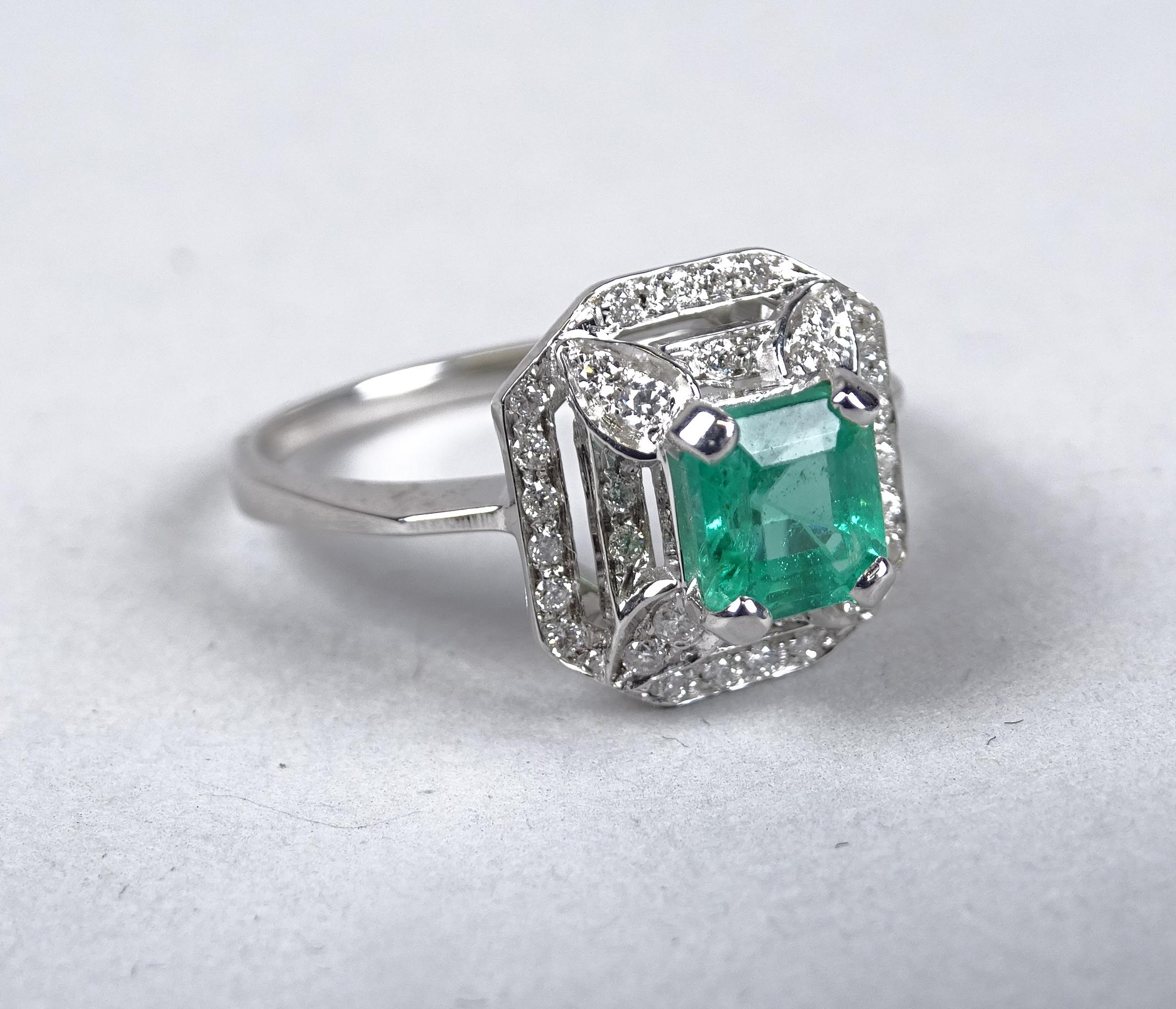 Bijou: Bague en or blanc 18K sertie d'une émeraude (coup) d'env. 0,92cts entourée de diamants pour env. 0,22cts P: 4,4g TDD: 56