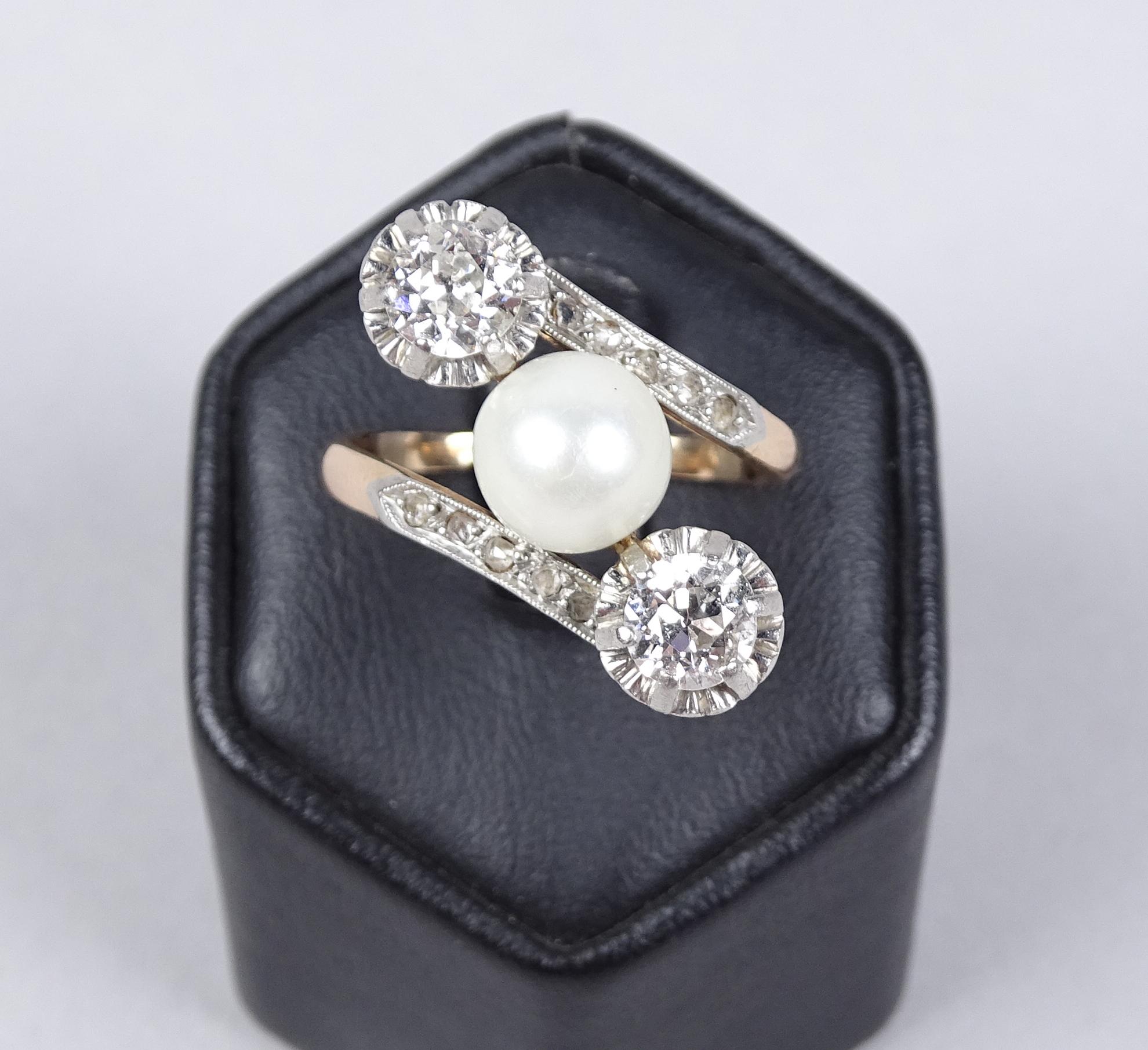 Bijou: Bague Toi et Moi en or jaune 18K et platine sertie d'une perle et de diamants pour env. 1ct P: 5,3g TDD: 53