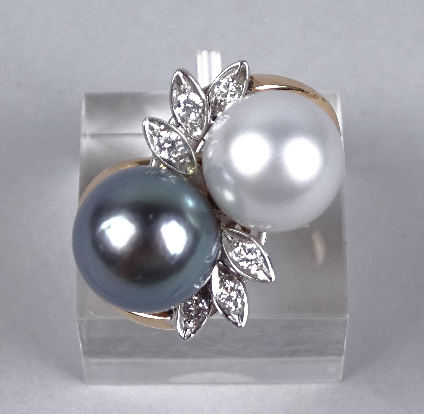 Bijou: Bague en or jaune et blanc 18K sertie de 2 perles Toi et Moi et de diamants pour env. 0,18cts P: 15,3g TDD: 57