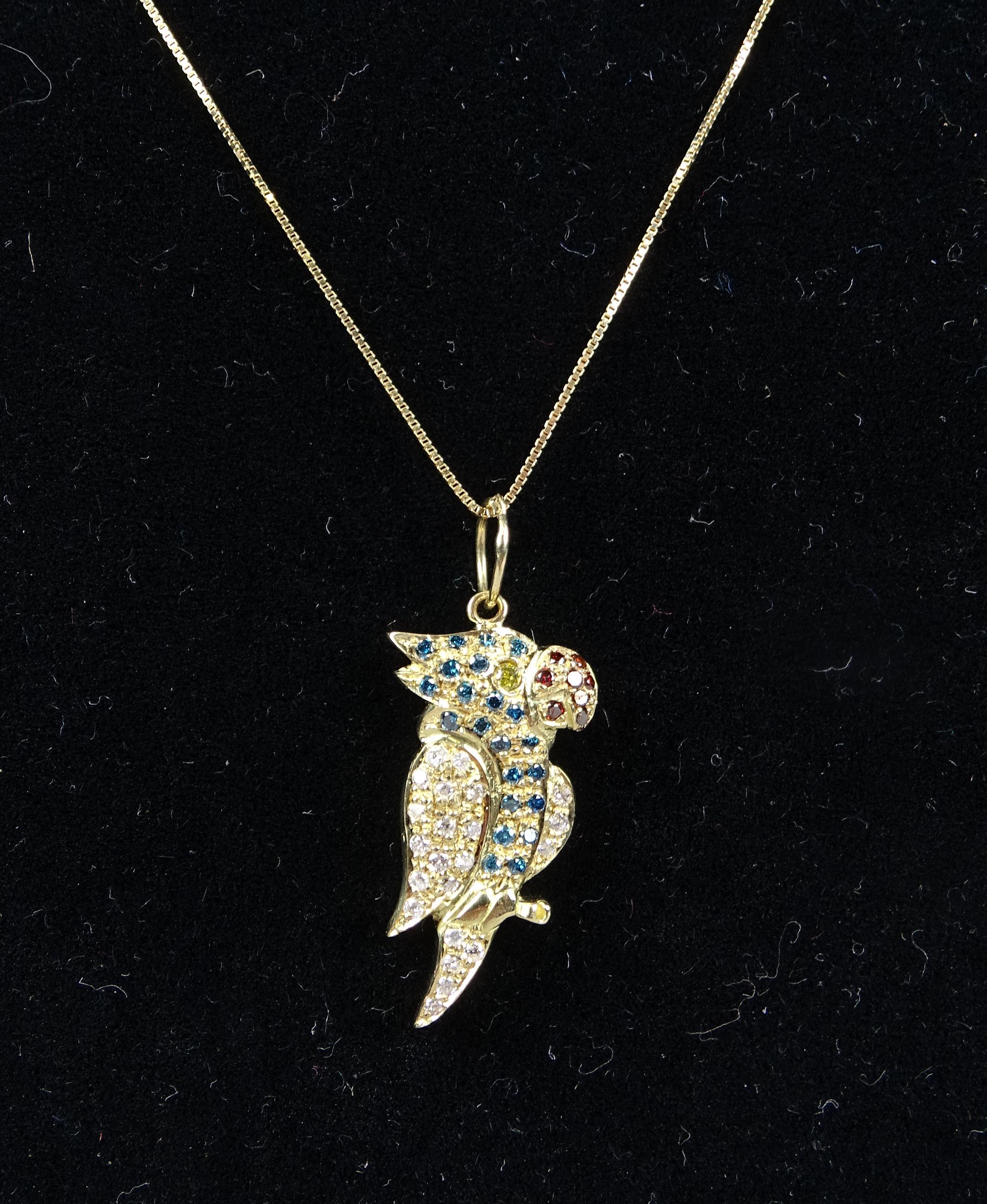 Bijou: Collier et pendentif -Perroquet- en or jaune 18K sertie de diamants colorés synthétiques pour env. 0,22cts P: 3,9gr