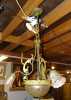Luminaire: Lustre en bronze et verre maté fin 19e-début 20eS 3+1lumières avec bobèches et vasque verre moulé maté décor de fleurs H: 90cm