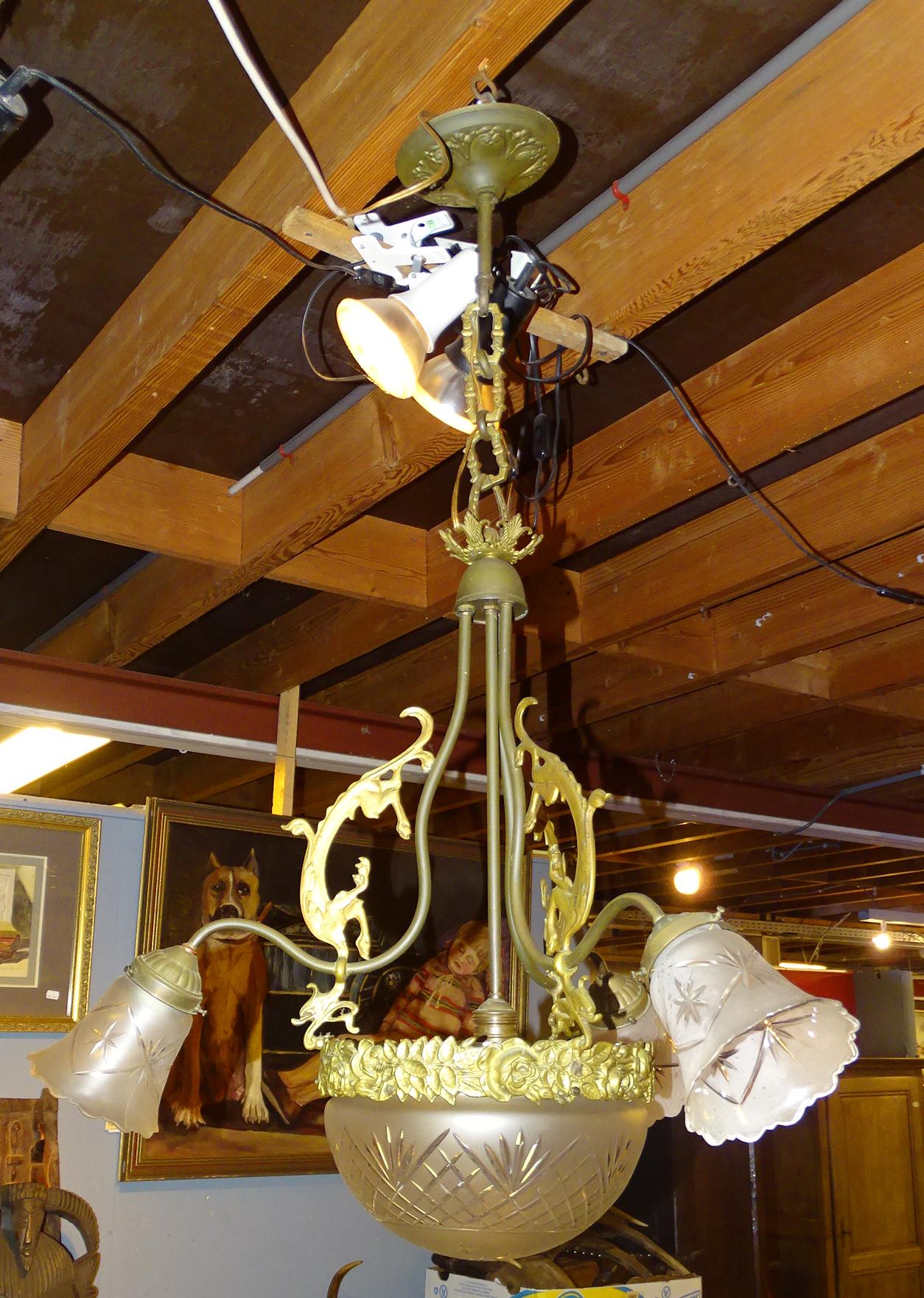 Luminaire: Lustre en bronze et verre maté fin 19e-début 20eS