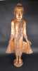 Asiatique: Sculpture Bouddha en bois doré BIRMANIE (fissure importante pans de robe) debout tenant son habit monastique rehauts de verroterie H:114cm