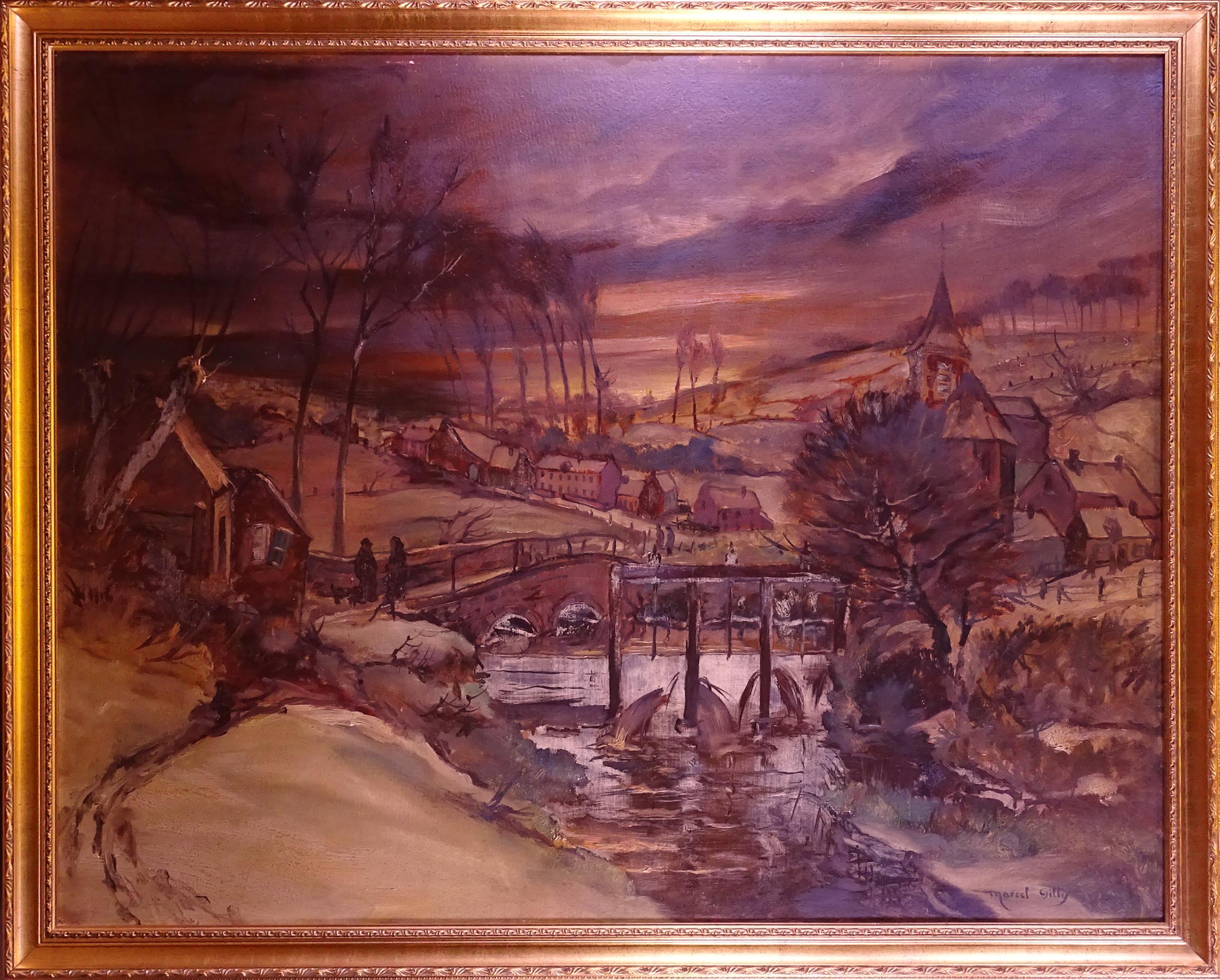 Tableau HSP -Paysage d'Asquillies- signé *GILLIS M.* (Marcel) (Mons 1897, 1972) 104x133cm cadre de style doré
