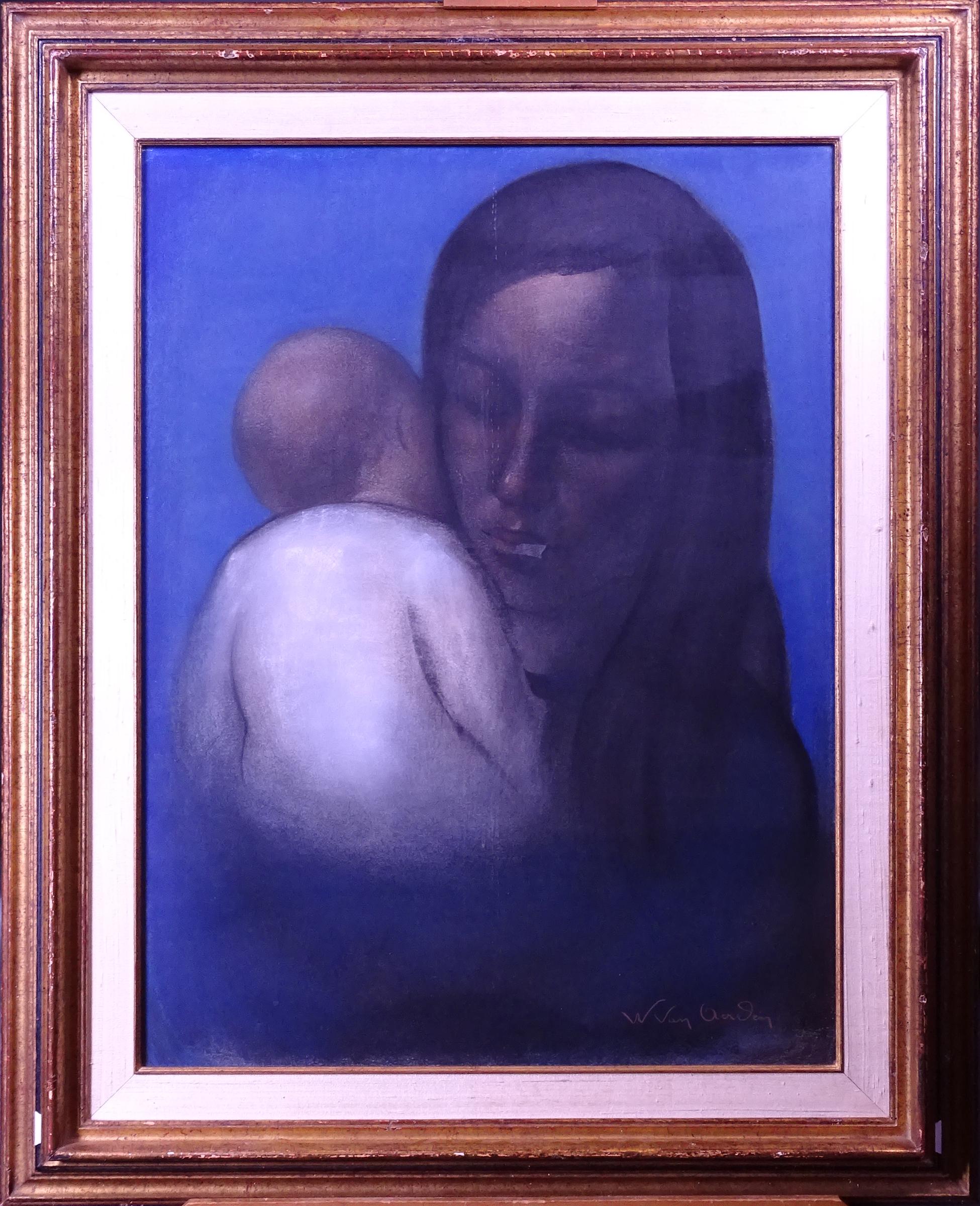 Tableau: Technique mixte -Mère et Enfant- signé *VAN AERDEN W.* (Willem) (Hervelee 1912, Gand 2000) 70x55cm cadre doré sous verre