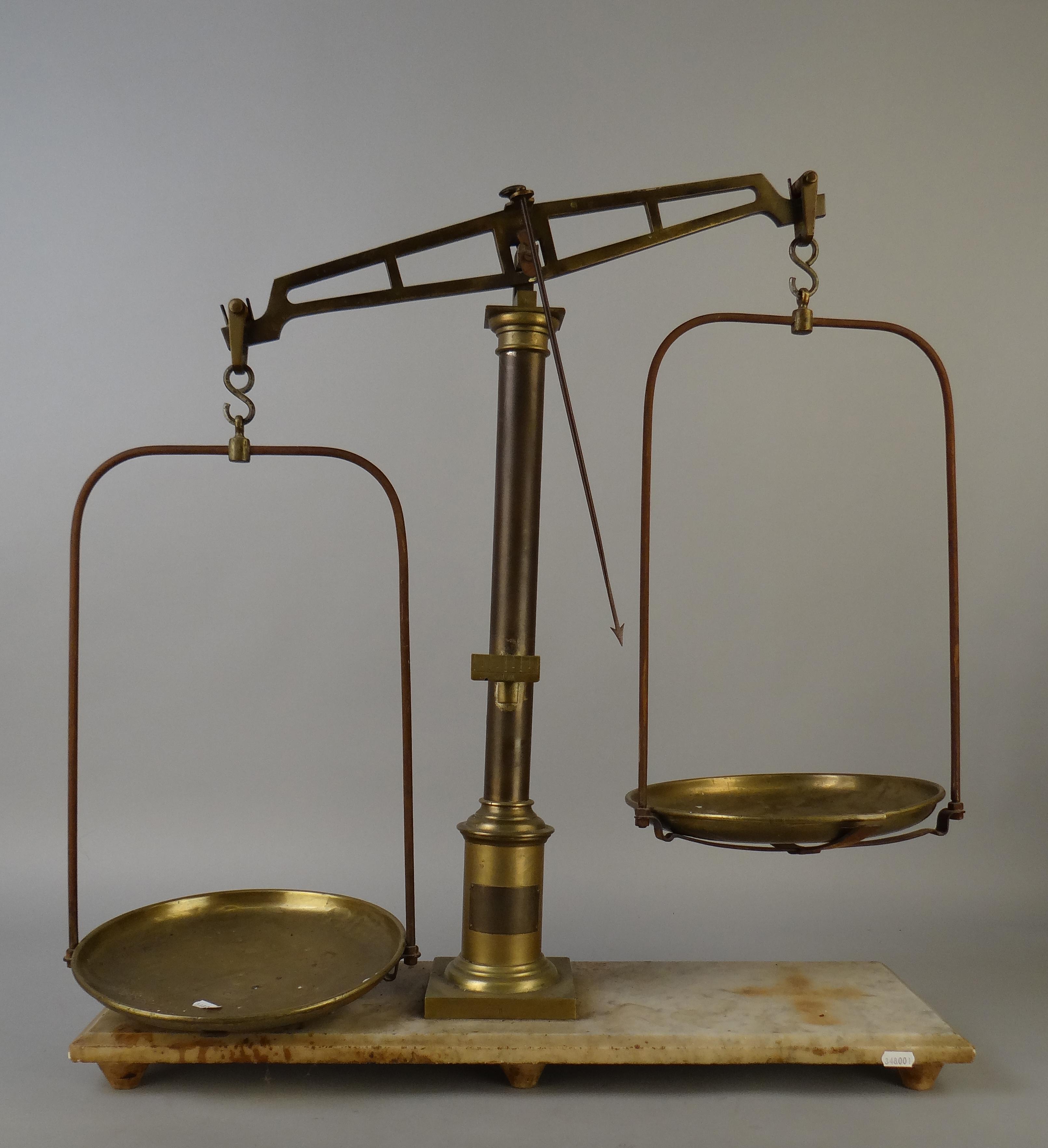 Objet: balance à bras égaux sur colonne en bronze plateaux en cuivre 19eS sur socle de marbre H:77cm