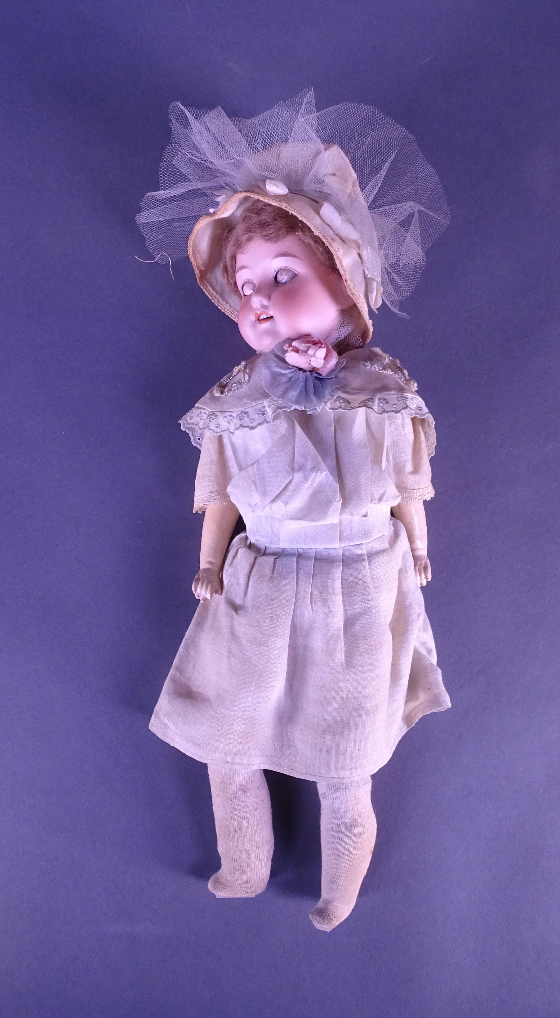 Doll: Poupée Armand Marseille 390 tête porcelaine yeux sulfure bouche ouverte composite articulée avec cheveux, vêtements, chapeau L:40cm