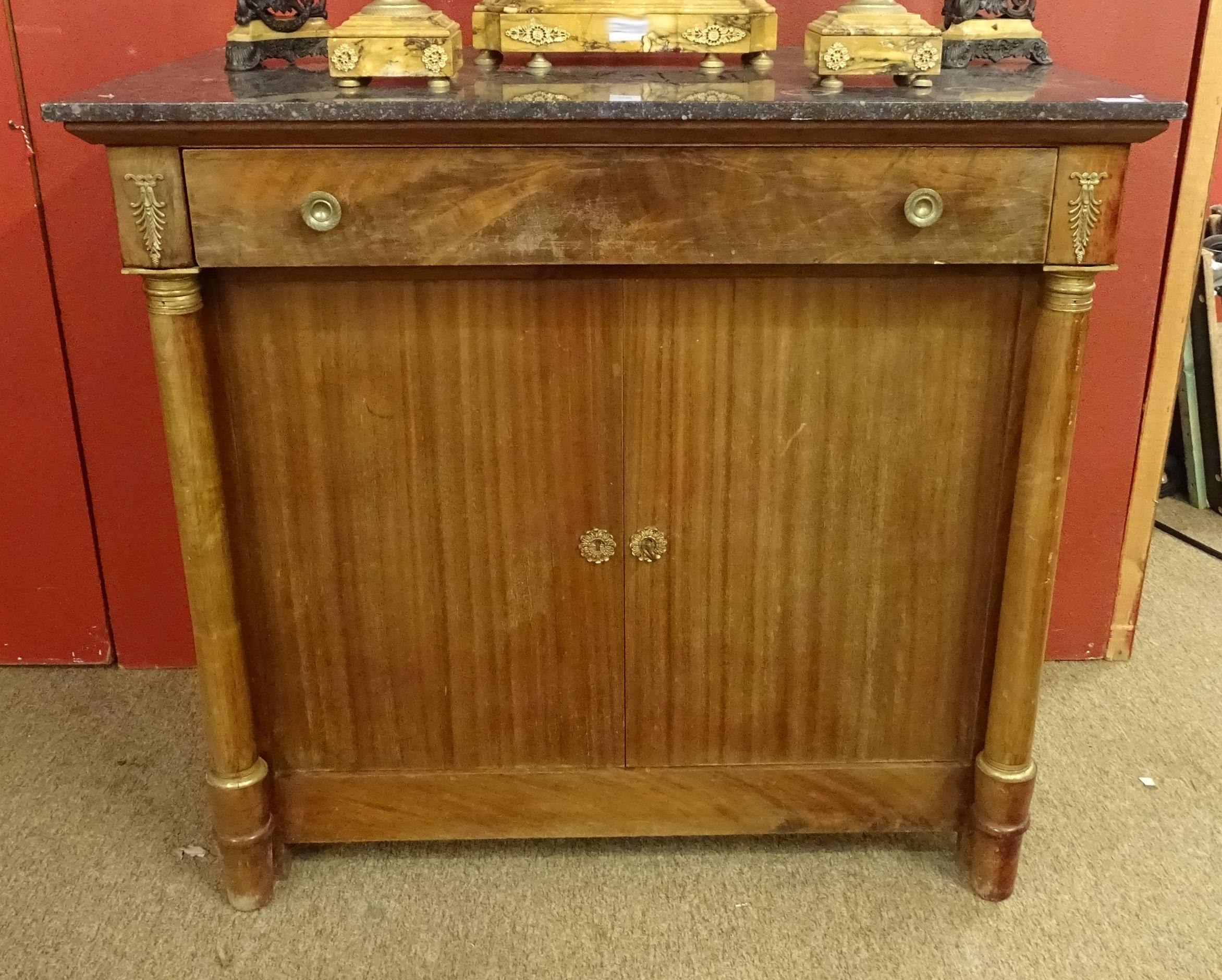 Meuble: Dresse en acajou de style Empire 1ère moitié 20eS 2P et 1T colonnes sortantes bronzes ciselés dessus marbre H:98 107x65cm