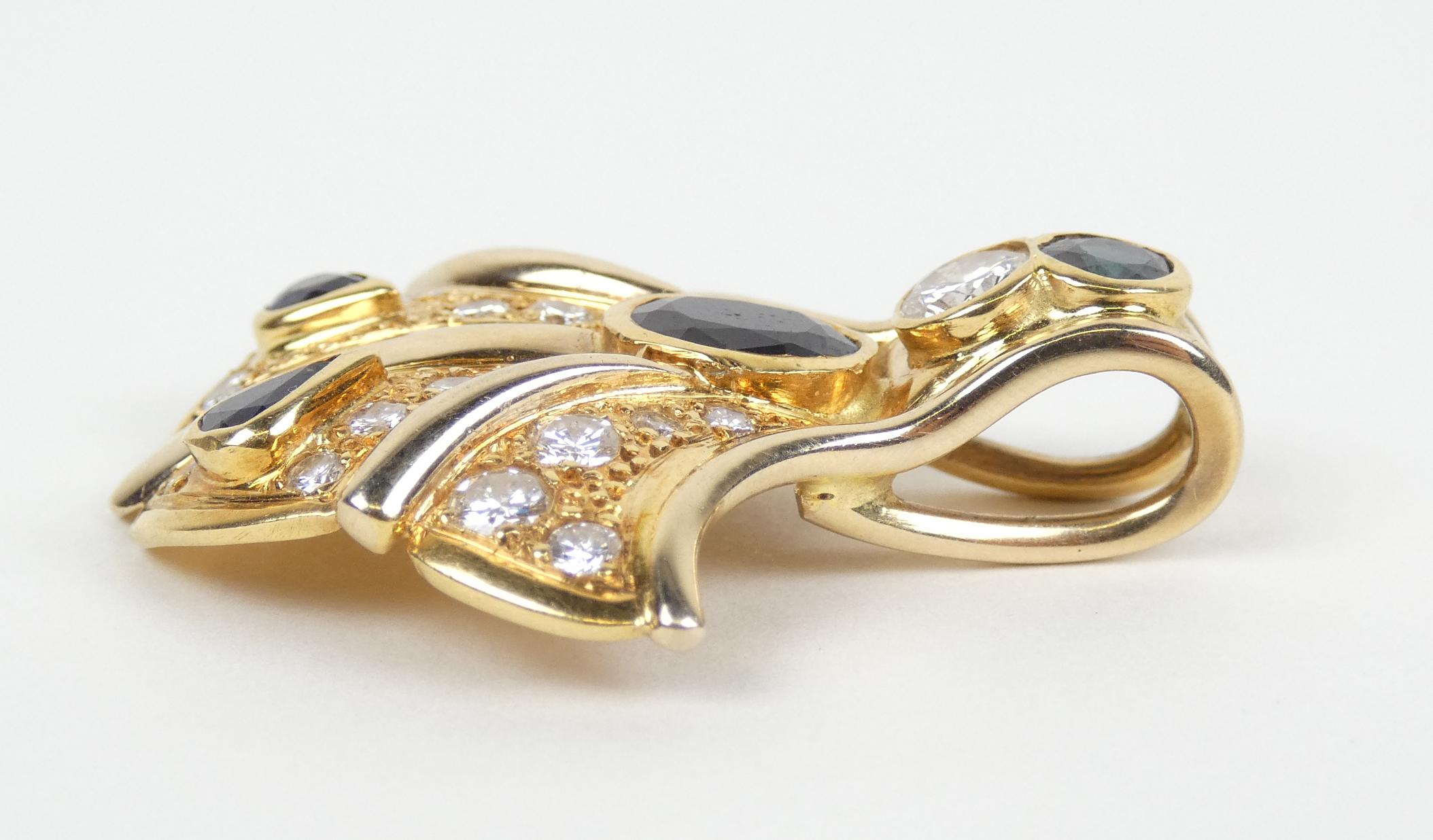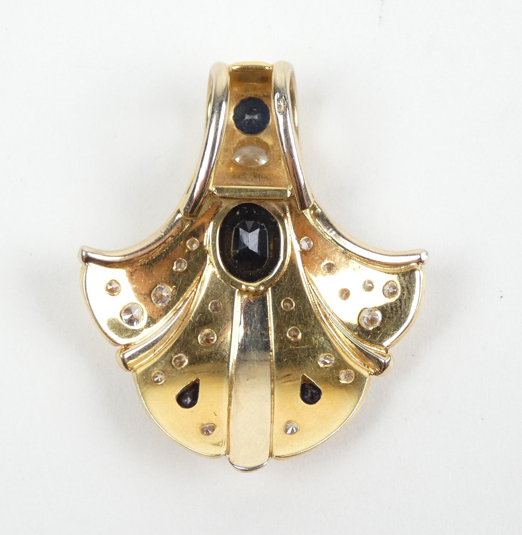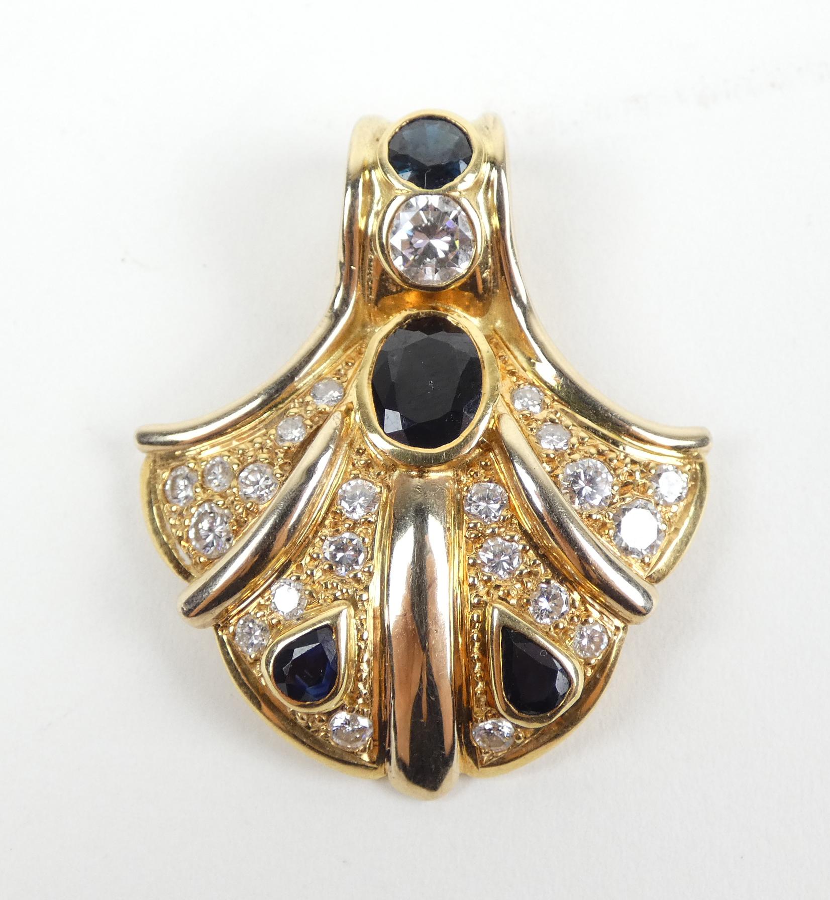 Bijou: Pendentif en or jaune 18K serti de diamants (principal env. 0,40cts) et de saphirs (principal env. 1ct) P: 13,7g L: env. 3,5cm