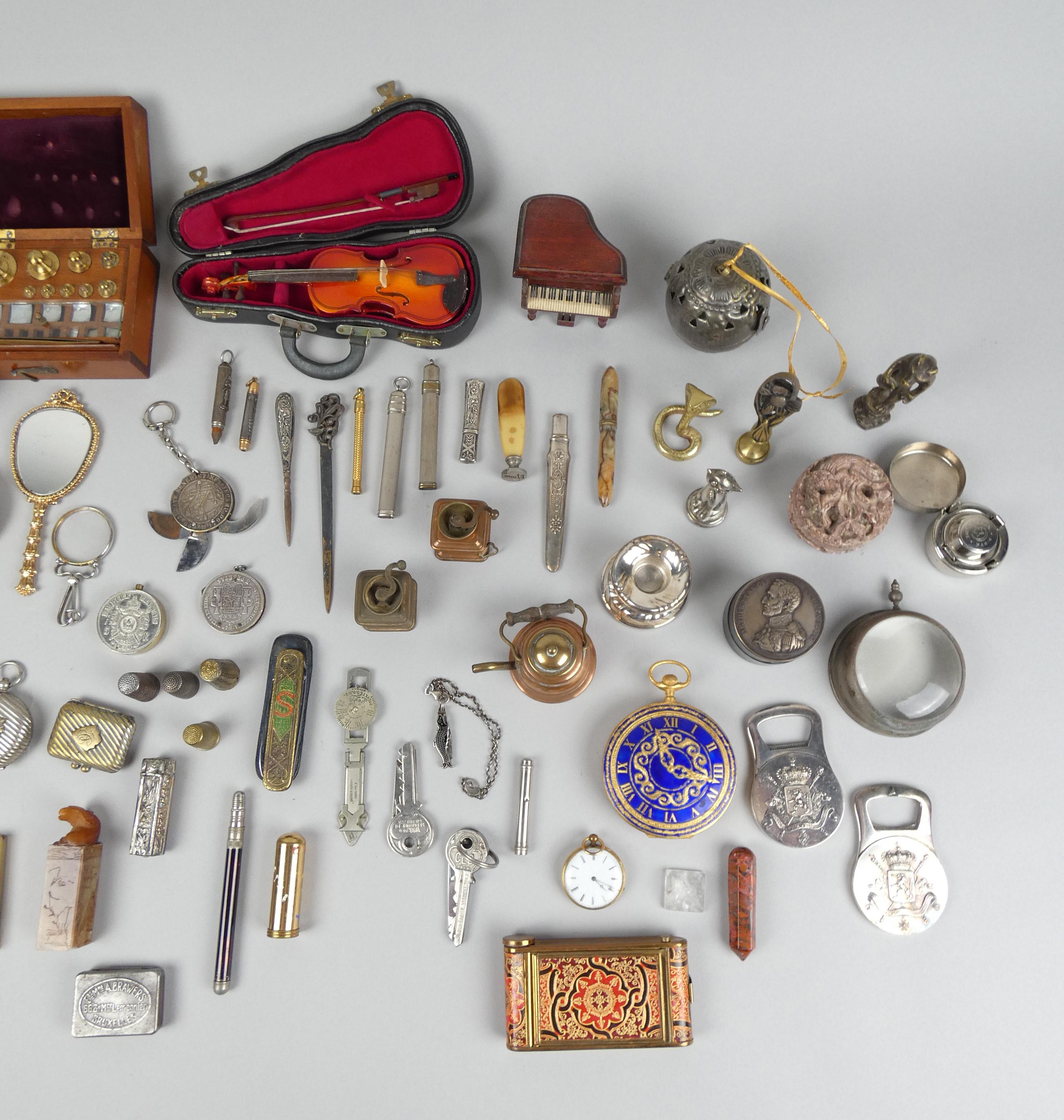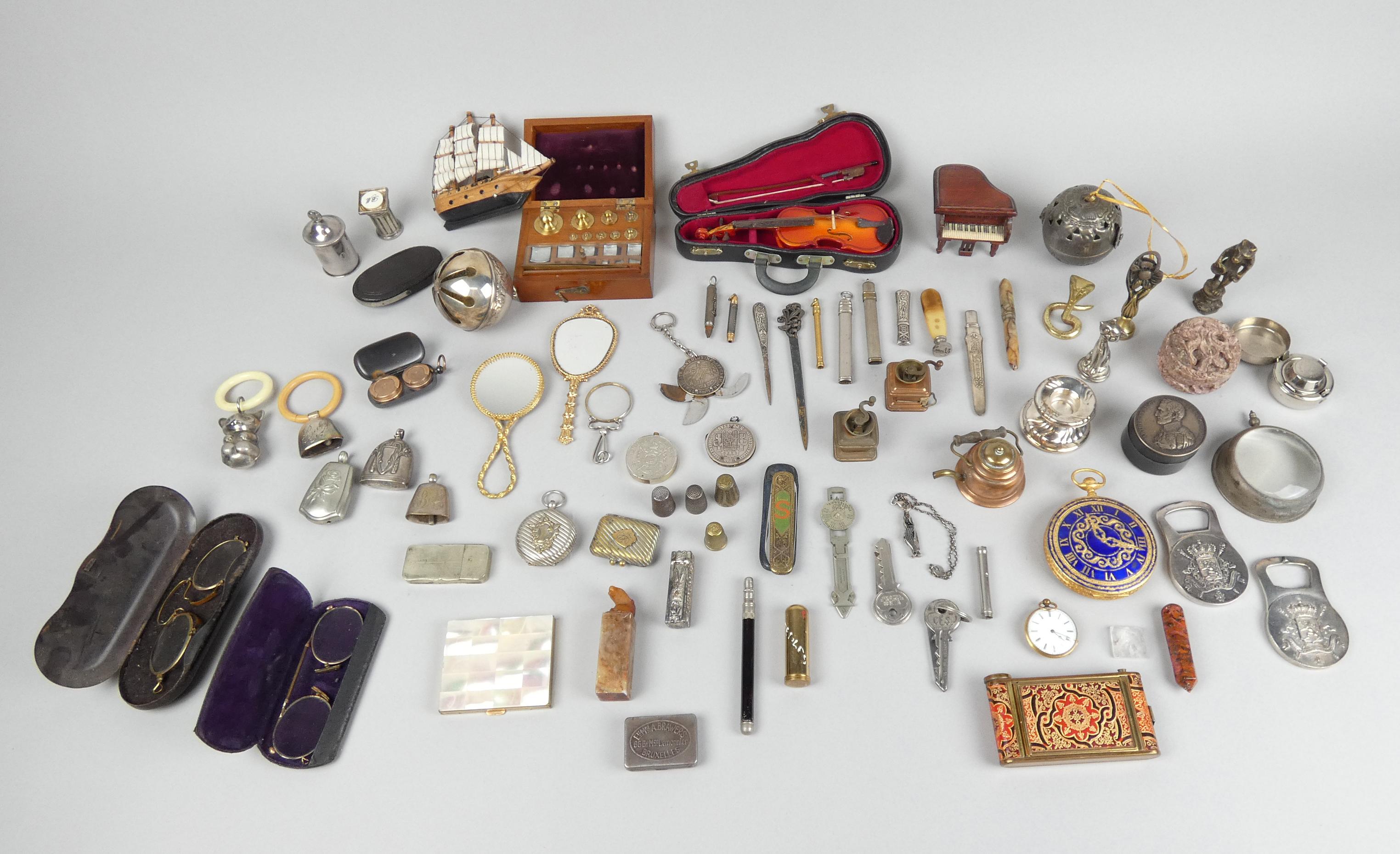 Objet: Curiosités: poudriers, crayons, dés à coudre, loupe, hochets, décapsuleurs,...