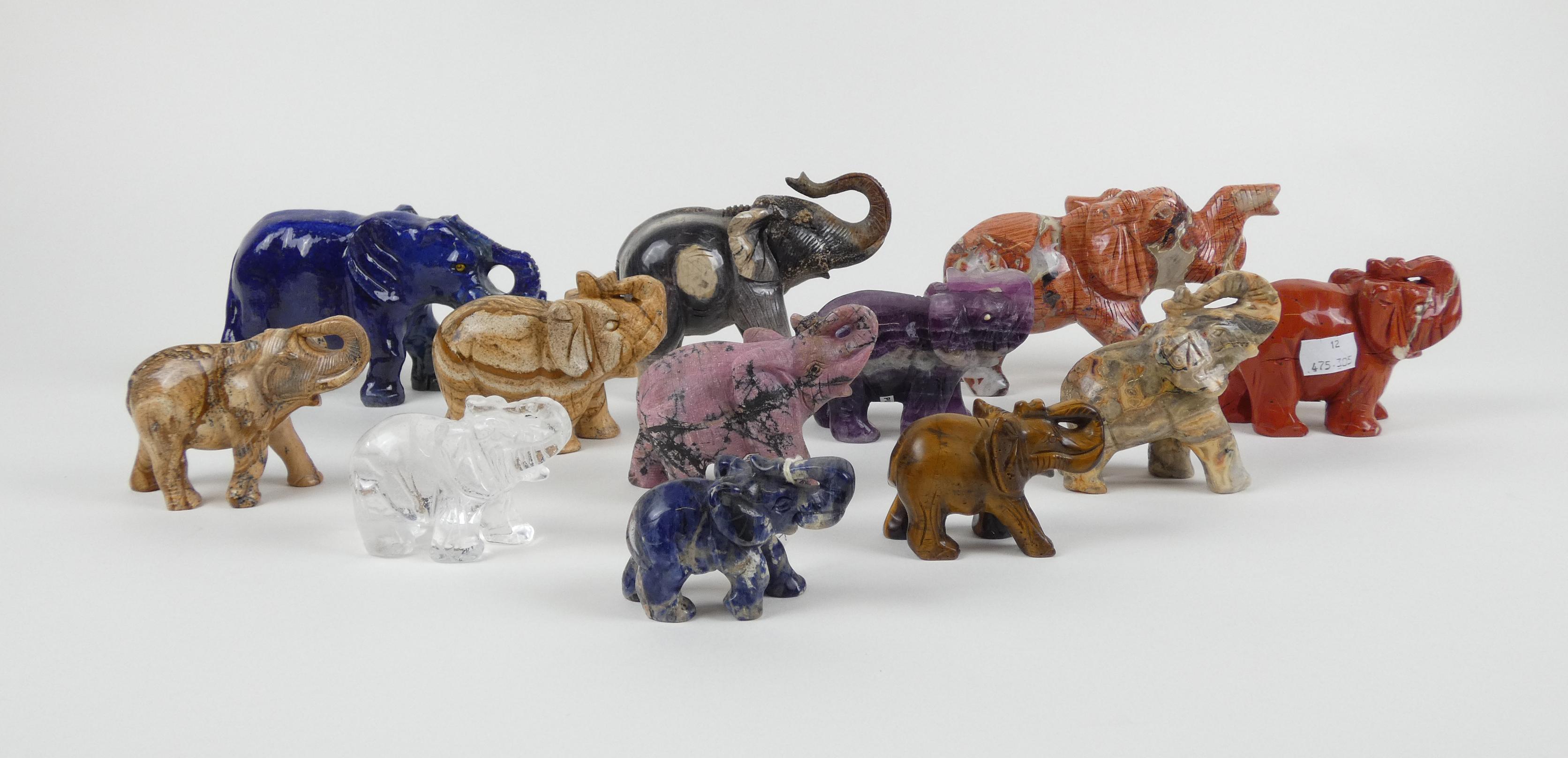 Collection: Lot d'éléphants en pierre dont rhodonite, jaspe, oeil de tigre, lapis-lazuli,. H: de 10 à 5cm (écl) (12pcs)