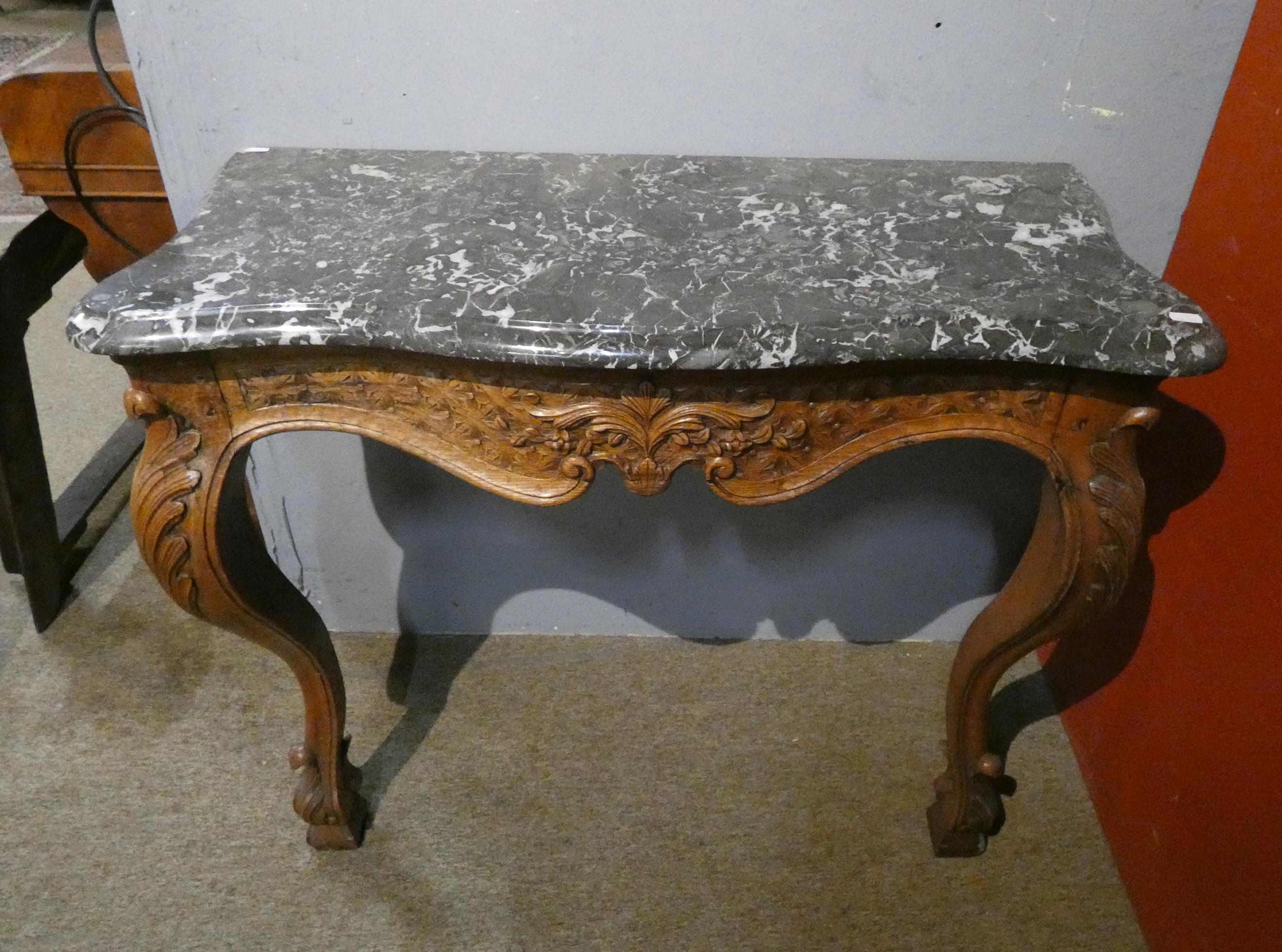 Meuble: Console en chêne sculpté attribué aux ébéniste Blot à Mons début 20eS dessus marbre 78x100x35cm