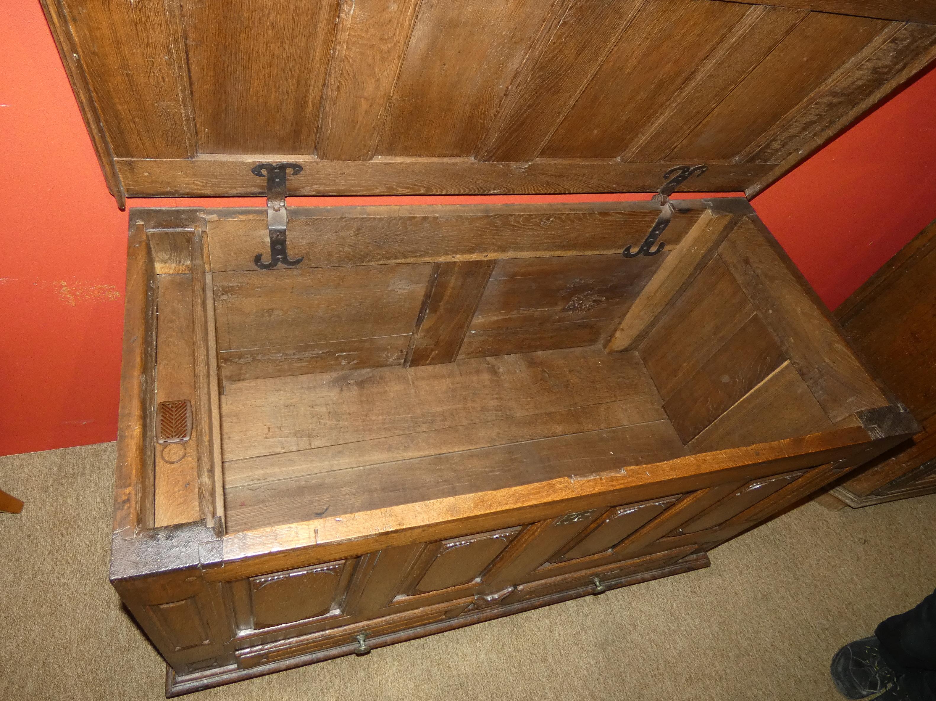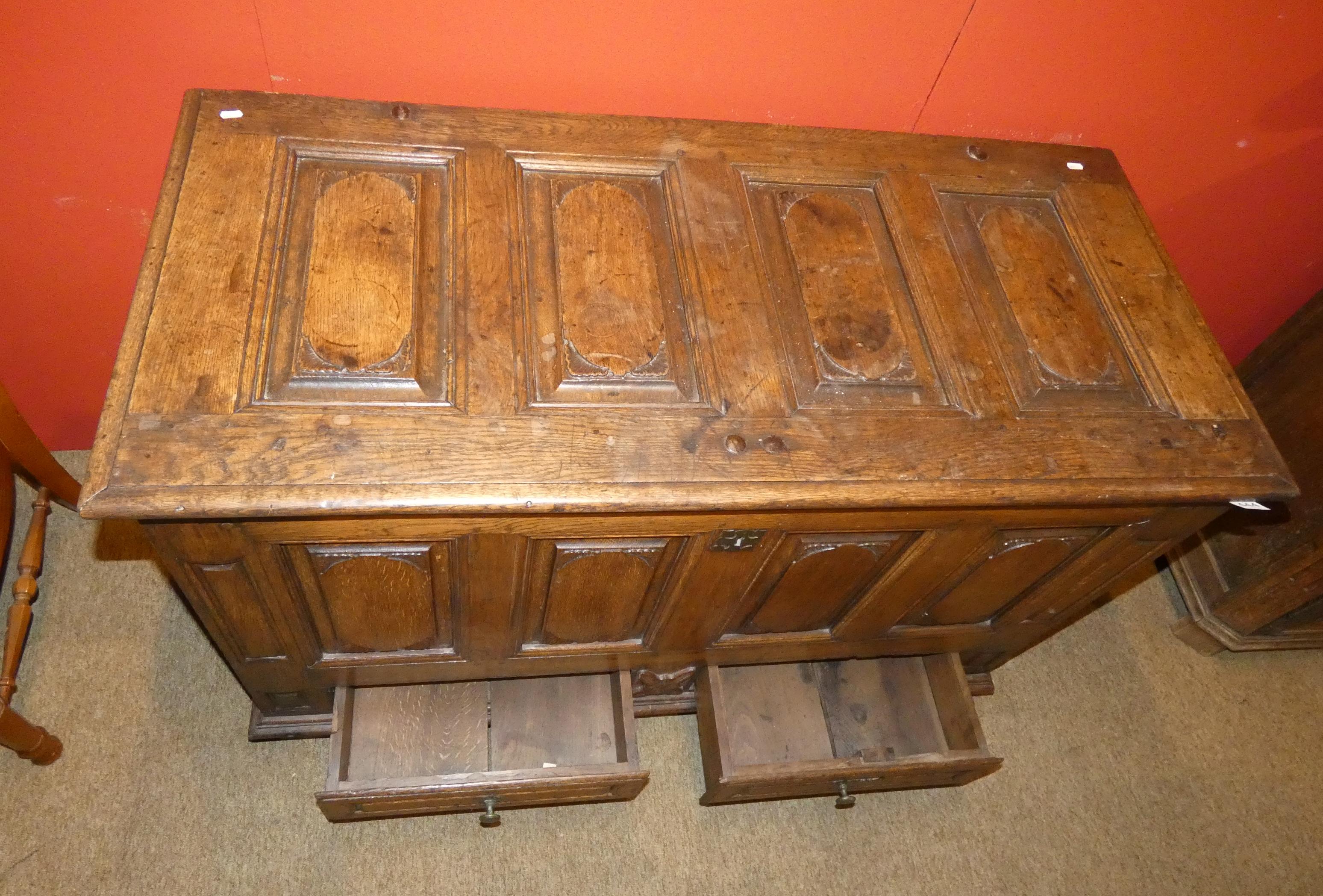 Meuble: coffre en chêne à panneaux dessus à panneaux avec 2 tiroirs 17eS H: 90x1
