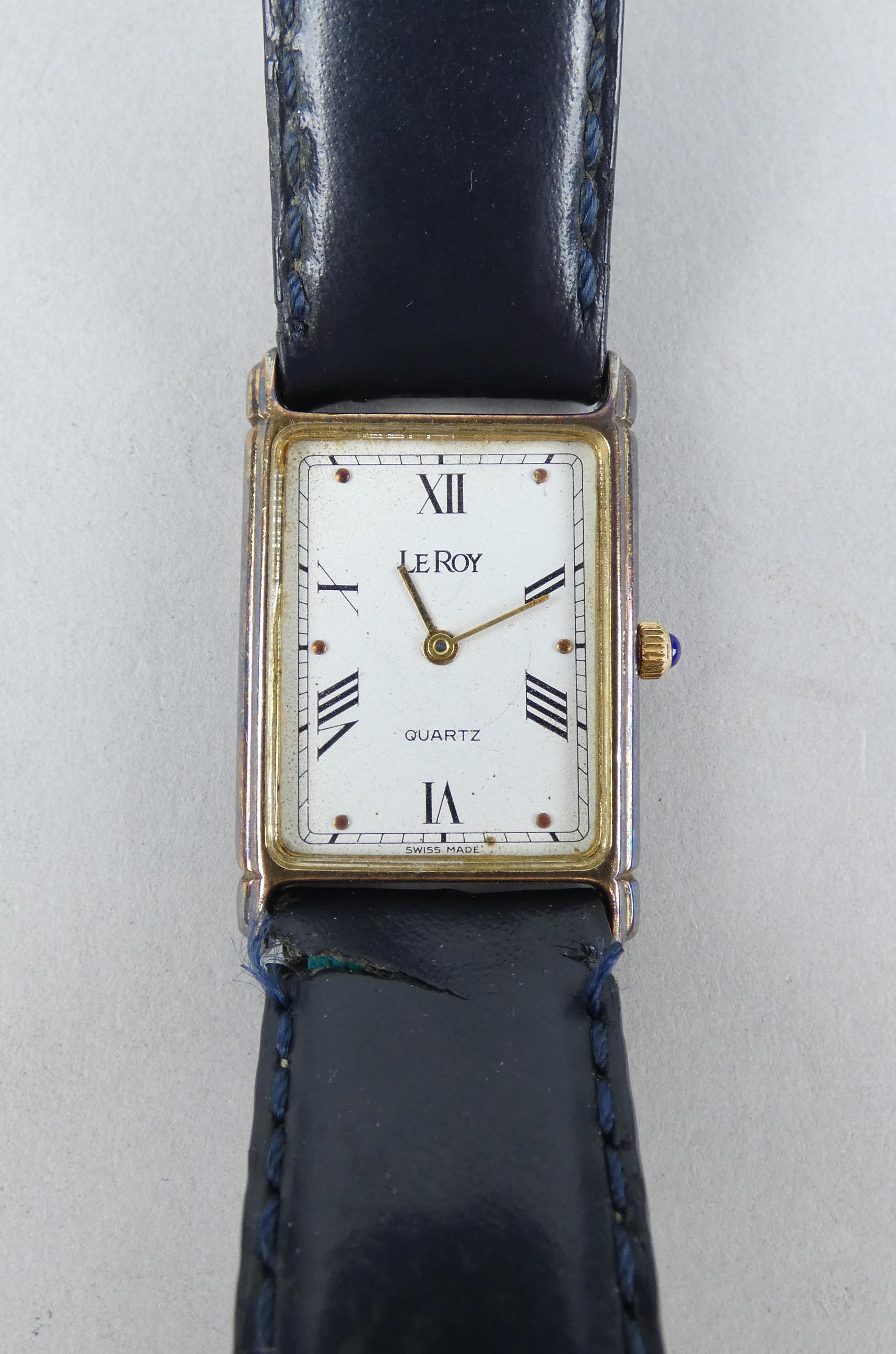Bijou: Montre bracelet d'homme rectangulaire cadran LEROY en argent 925 plaqué or mvt à quartz (non testé) 33x22mm Ptot: 22,8g avec bracelet (usures)