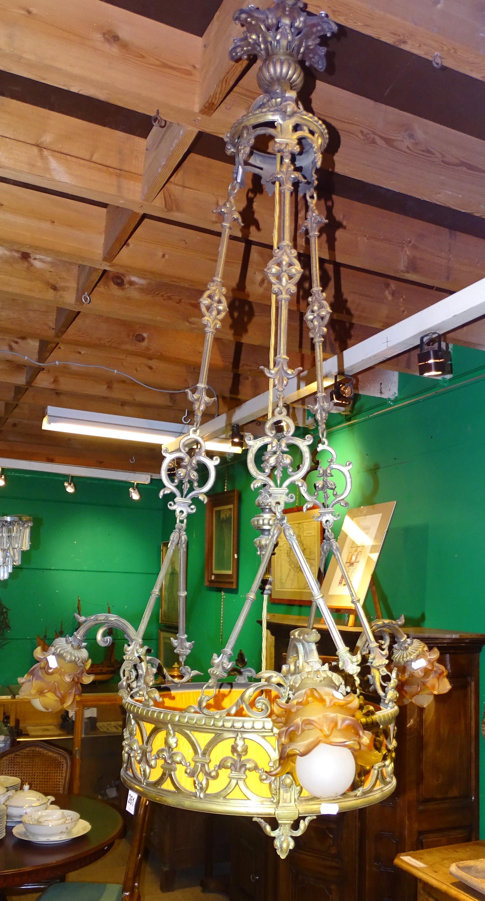 Luminaire: lustre en bronze a/ bobèches rose de Redouté ambre (1 détachée) H:120