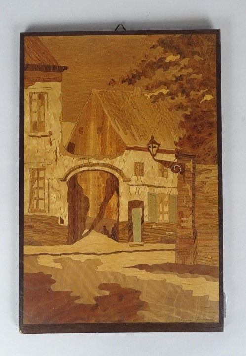 Tableau Panneau de marqueterie -Vieil Anderlecht- signé *GODARD R.* (René) (20èS) 29x19cm
