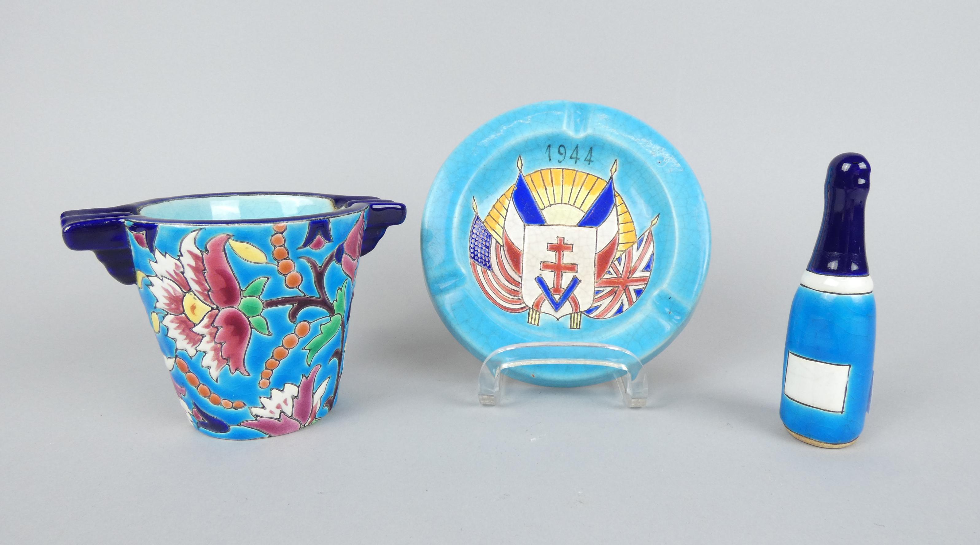 Céramique: Faïence de Longwy Cendrier -Libération 1944- + vase et bouteille (3pcs) (egr)