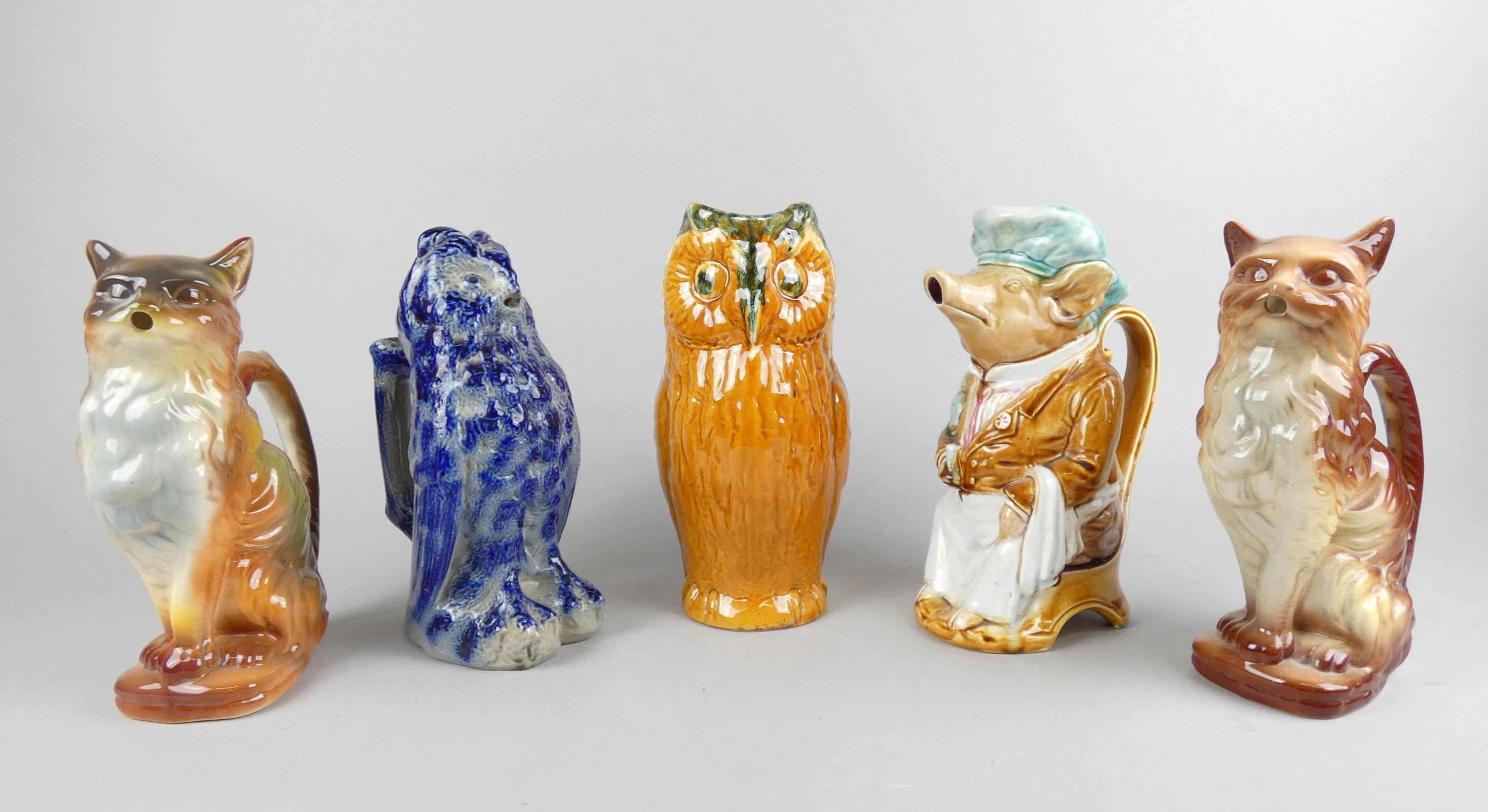 Ceramique: pichet en faience (egr) (5): Saint Clément (2) chat H25,5+ Hibou grès bleu H26 + hibou H27+ Cochon aubergiste attribué à Onnaing H26,5cm (acc) (5pcs)